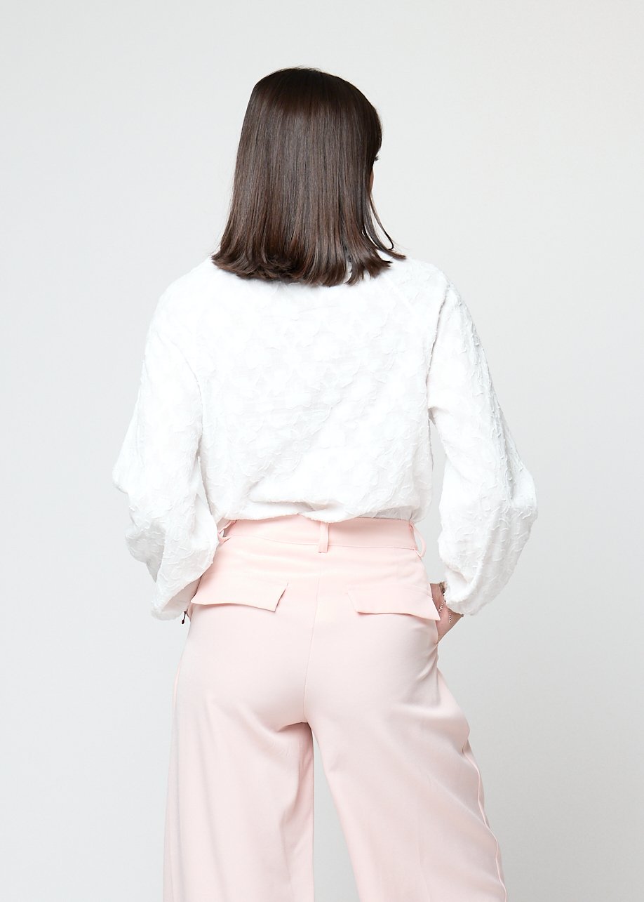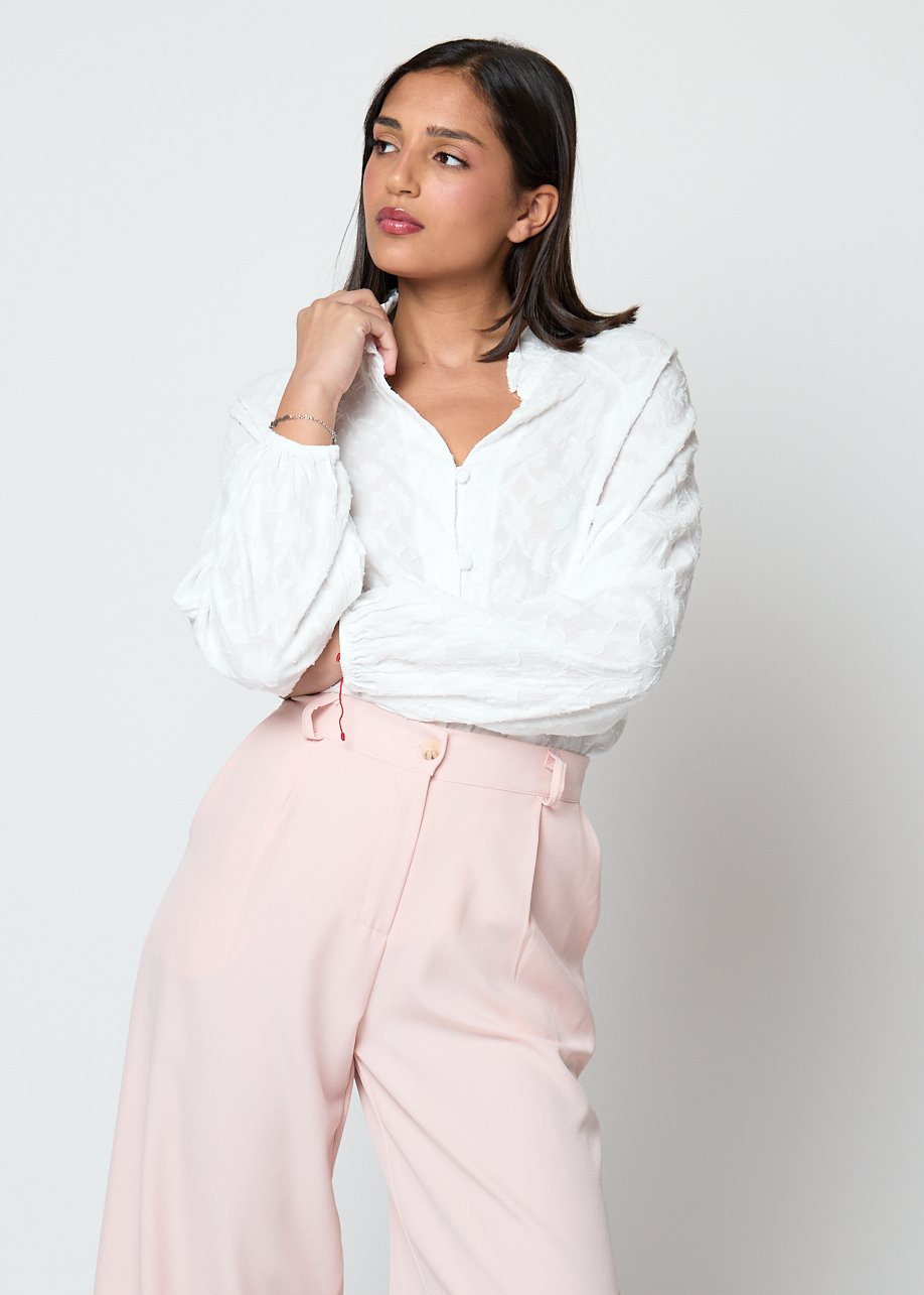 Blusa blanca de manga larga con textura delicada. Elegante, ligera y perfecta para looks casual chic.