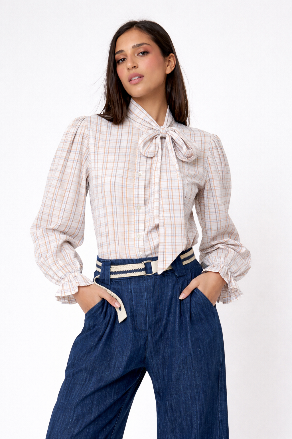 La Blusa Brisa destaca por su delicado estampado de cuadros en tonos suaves y su elegante lazada en el cuello, un detalle que aporta un aire femenino y cuidado sin resultar excesivo.