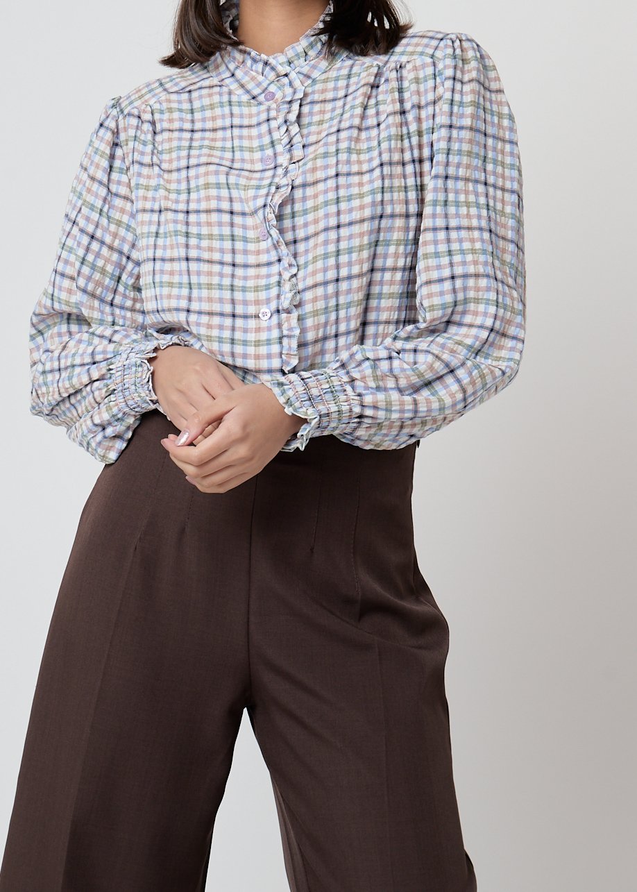 Blusa de cuadros con volantes y cuello alto. Femenina, elegante y perfecta para looks casual chic con personalidad.