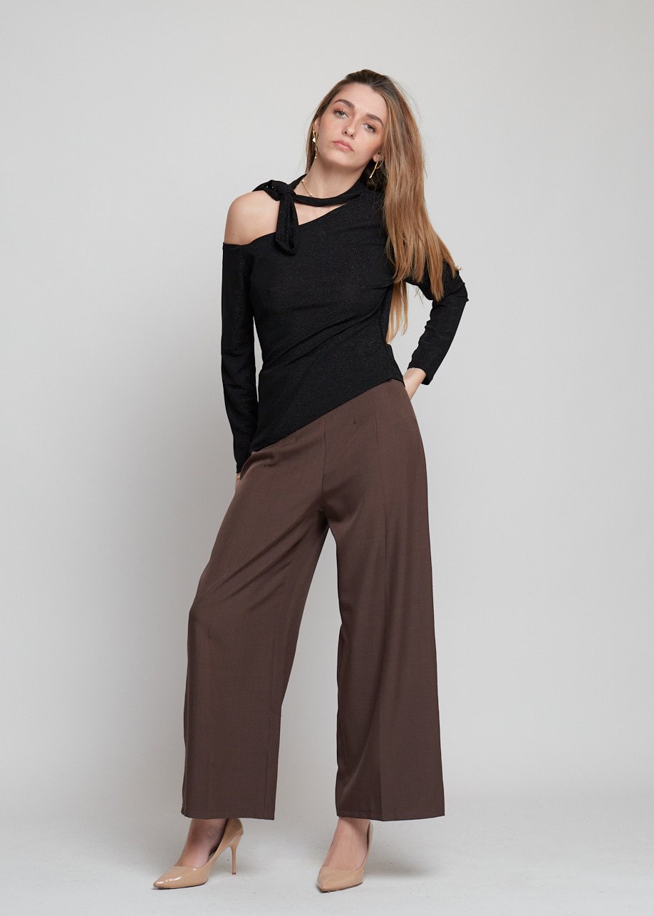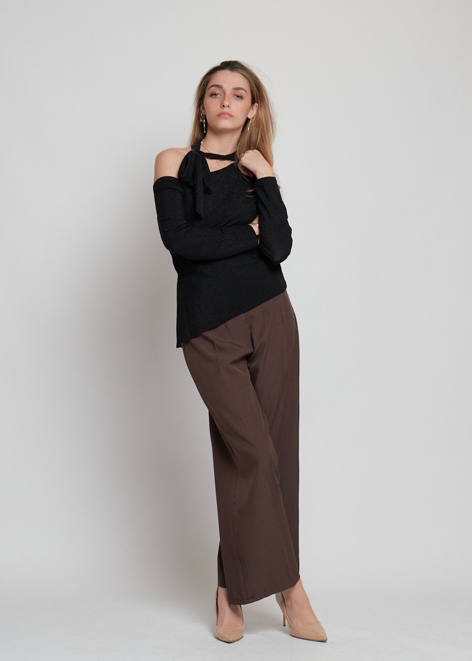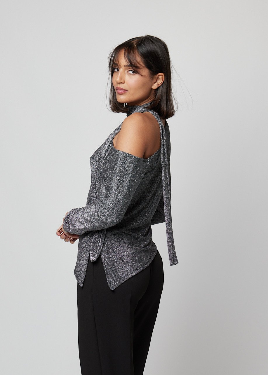 Blusa asimétrica con brillo y detalle al cuello. Moderna, elegante y perfecta para looks casual chic.