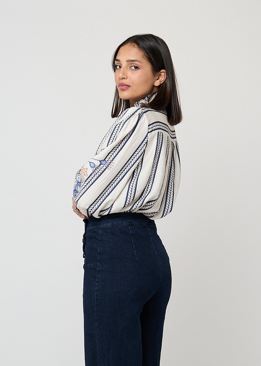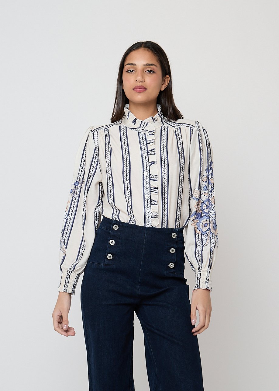 Su delicado estampado en tonos neutros y azul aporta luz y elegancia, mientras que el cuello alto con detalle fruncido y la botonadura frontal con volantes añaden un toque femenino y refinado. Las mangas largas ligeramente abullonadas estilizan la silueta y aportan movimiento.