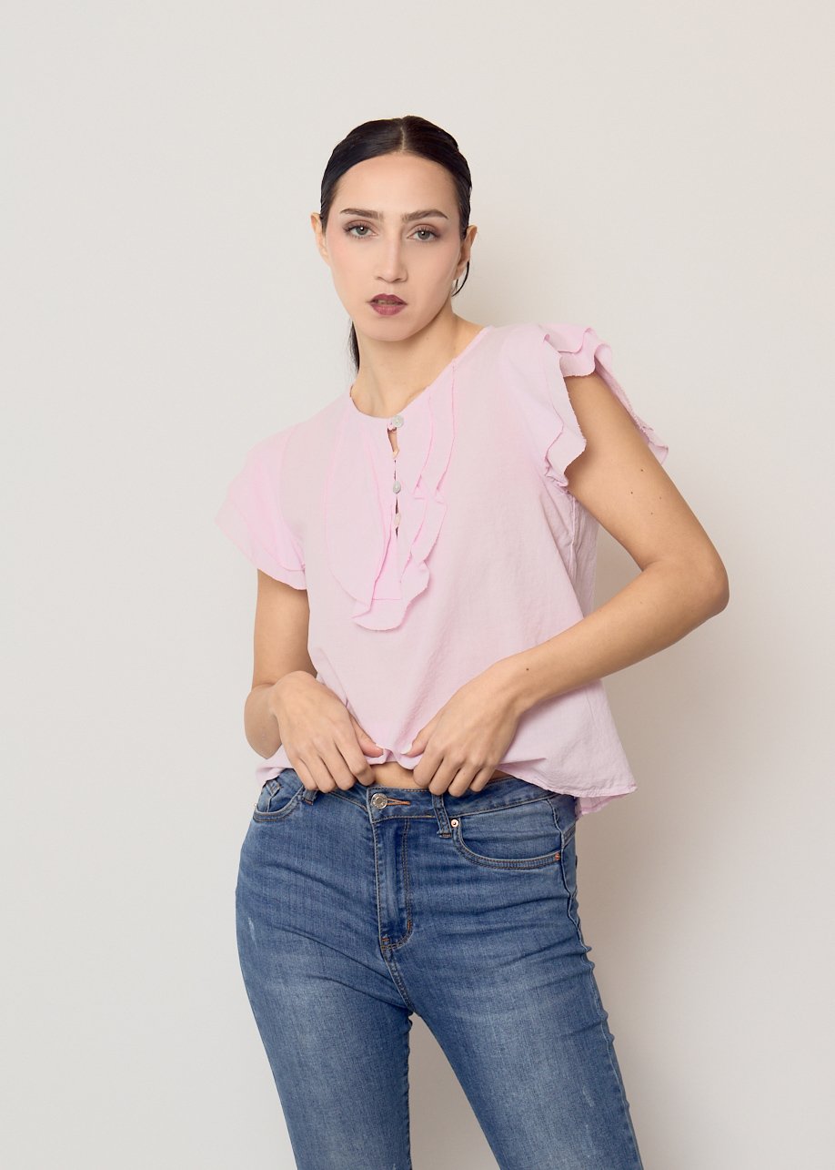 Blusa Fiora rosa con volantes y botones frontales. Ligera, femenina y perfecta para looks casual chic.