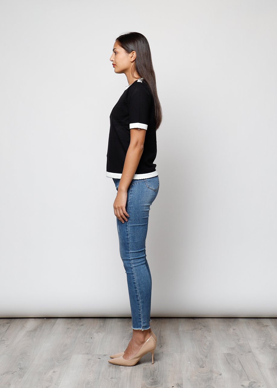 Blusa Loreto negra con toques blancos y botones joya en los hombros, una prenda casual elegante y versátil para cualquier ocasión.