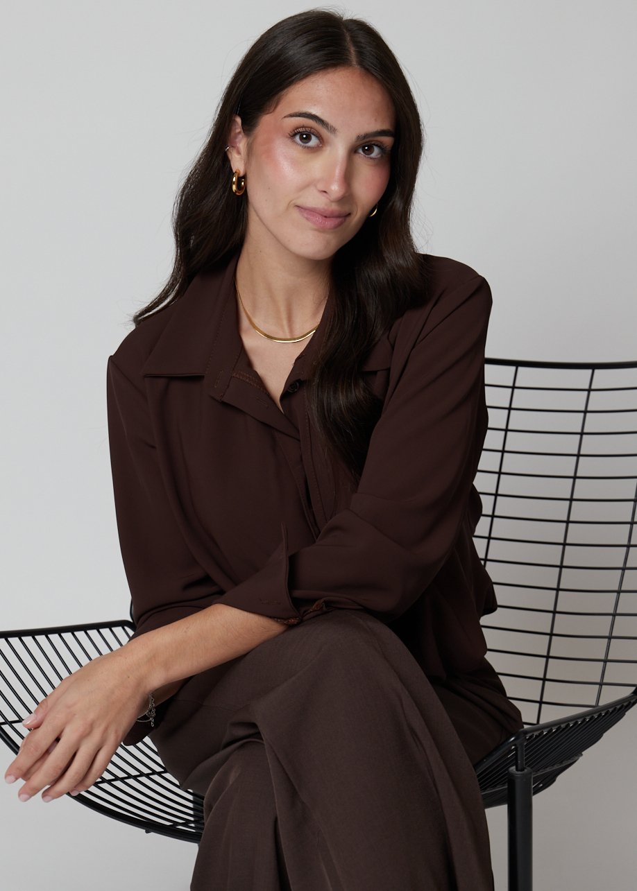 La Blusa Maya combina sencillez y sofisticación en una prenda que no puede faltar en tu armario. Confeccionada en un tono marrón intenso, su diseño de manga larga con cuello camisero aporta un aire moderno y femenino, realzando la figura con un detalle original y favorecedor.