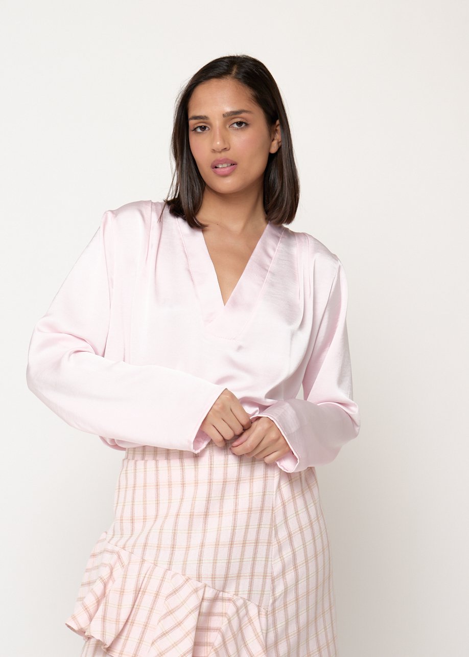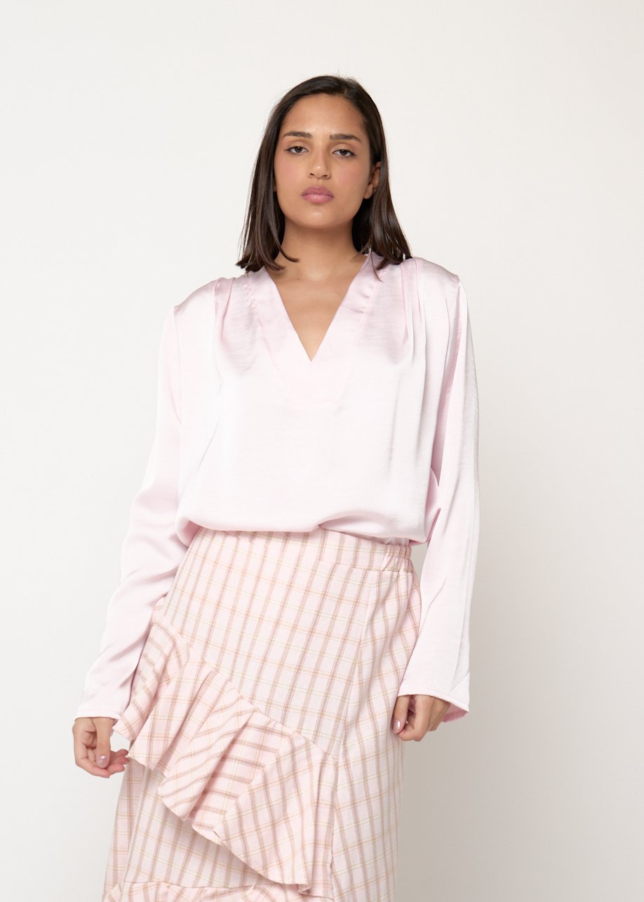 Blusa rosa satinada con escote en V y caída fluida. Elegante, femenina y perfecta para looks casual chic.
