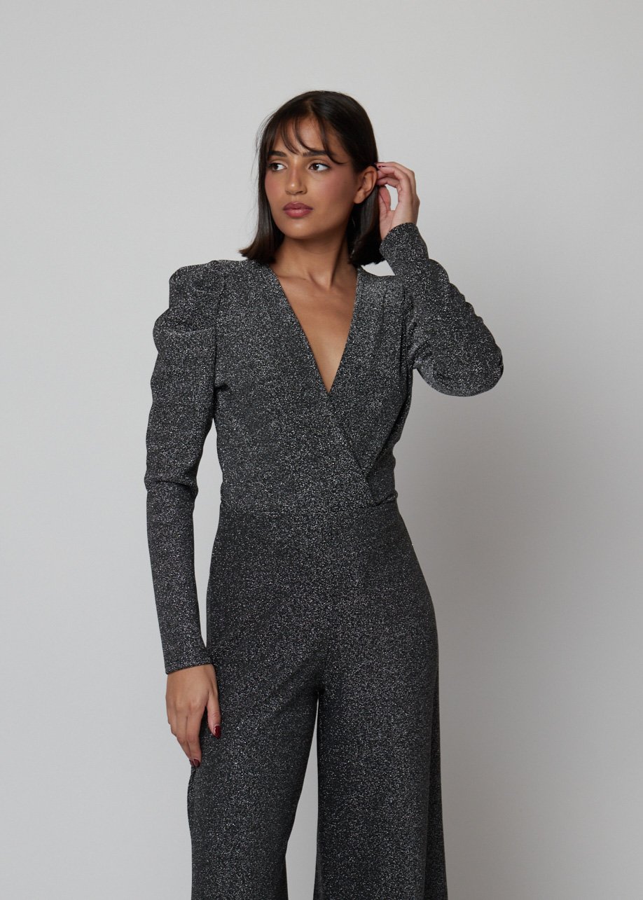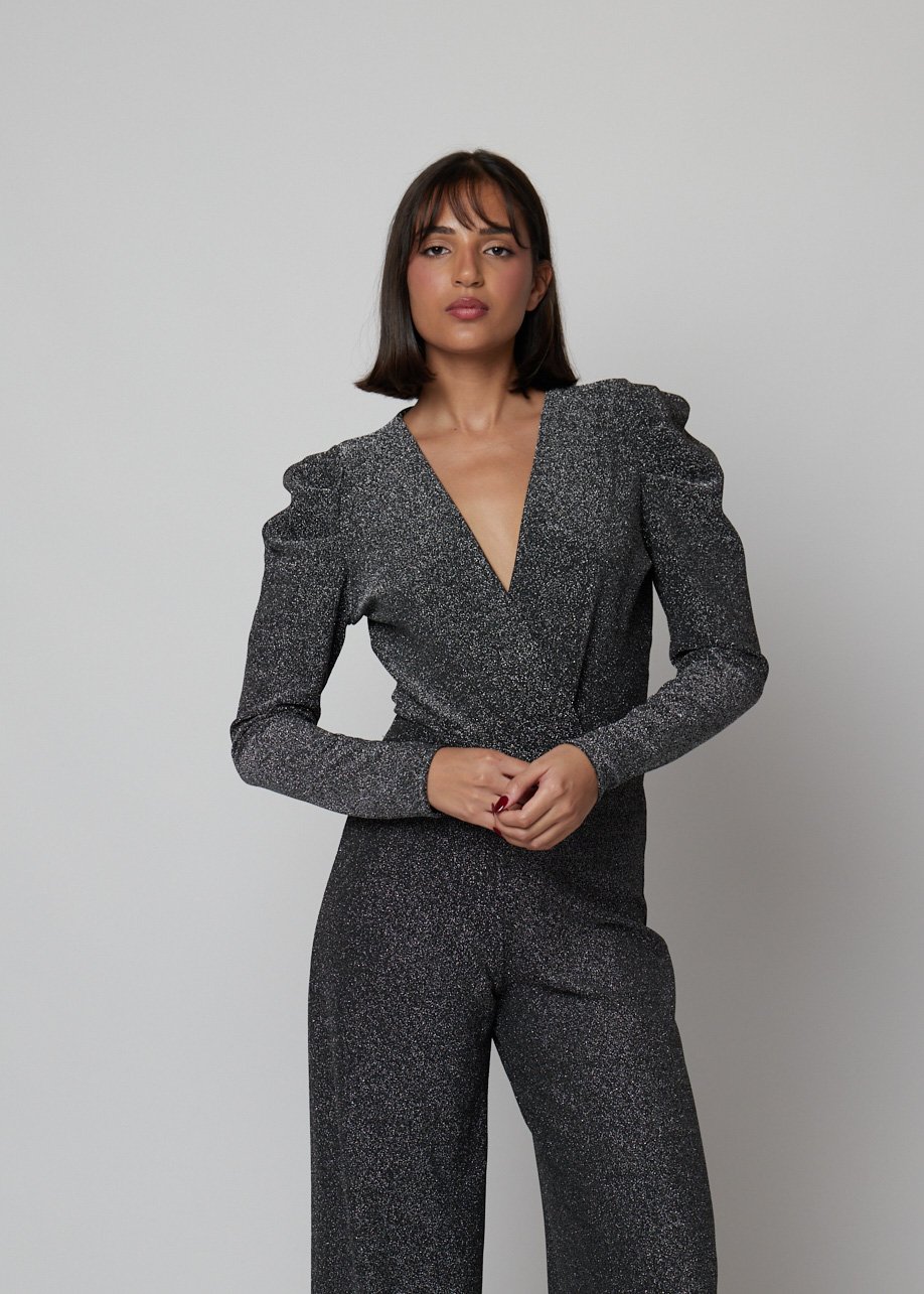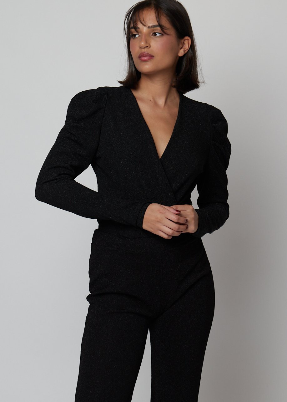 Body cruzado de brillo lurex con manga larga y escote en V, estilo casual elegante.