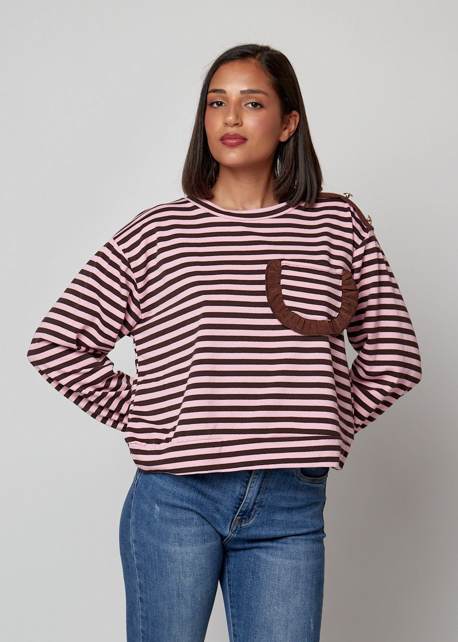Camiseta casual de rayas rosa y marrón con bolsillo decorativo. Cómoda y divertida para primavera verano 2026.