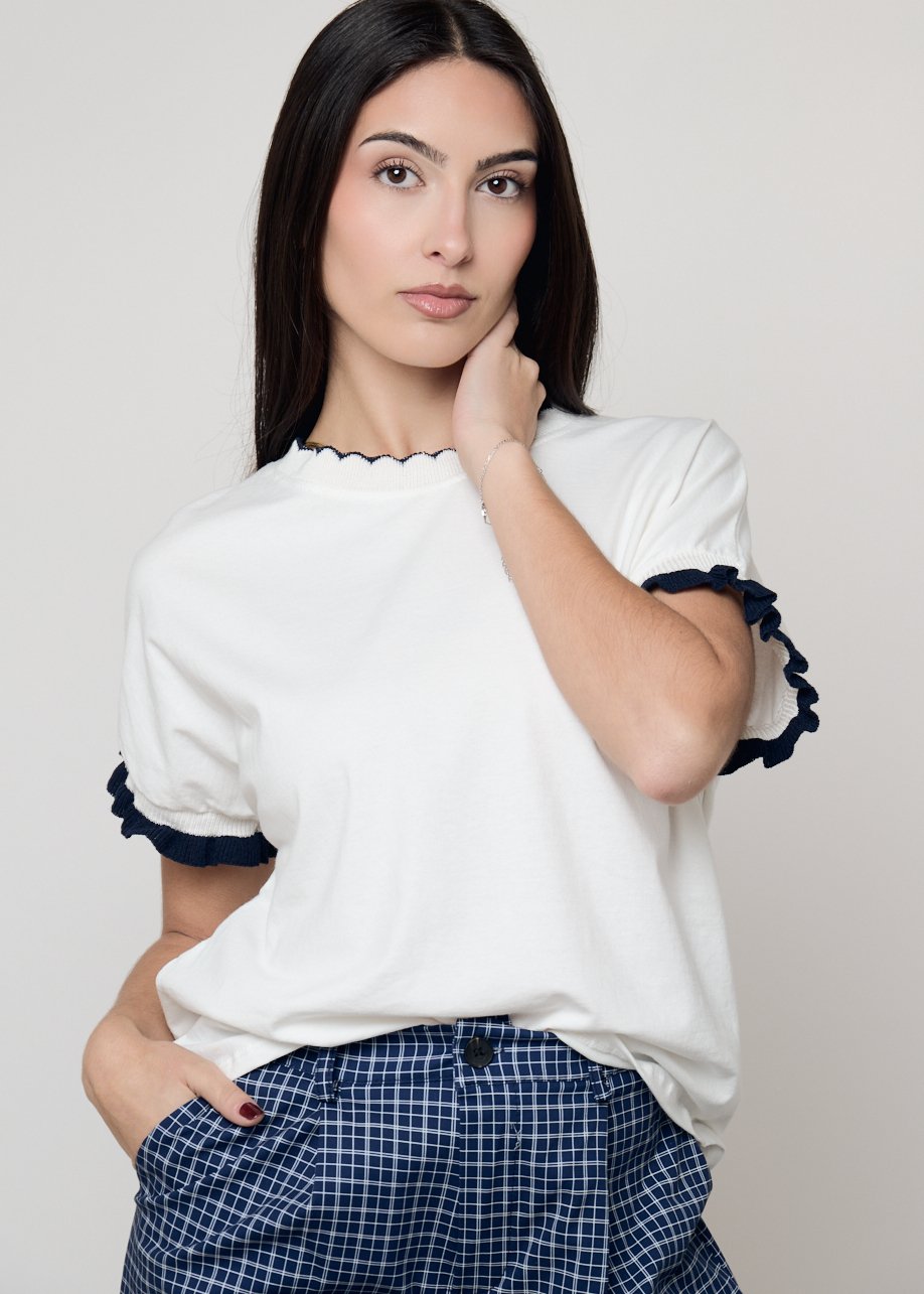 Camiseta blanca de mujer con mangas cortas y detalles en contraste. Un básico elegante y versátil para looks casual chic.