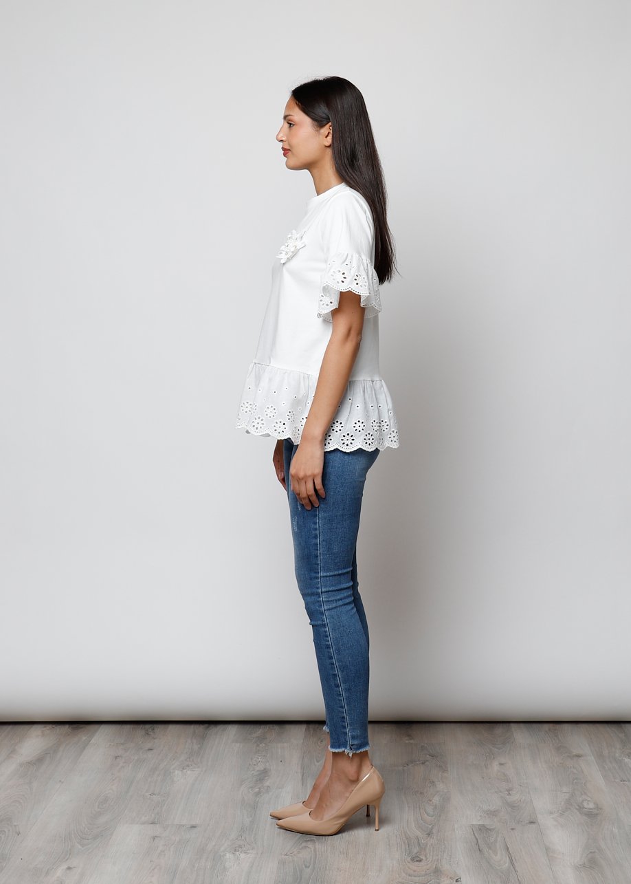 Camiseta Escosia blanca con volantes bordados y detalle floral, un básico casual femenino y versátil para tu día a día.