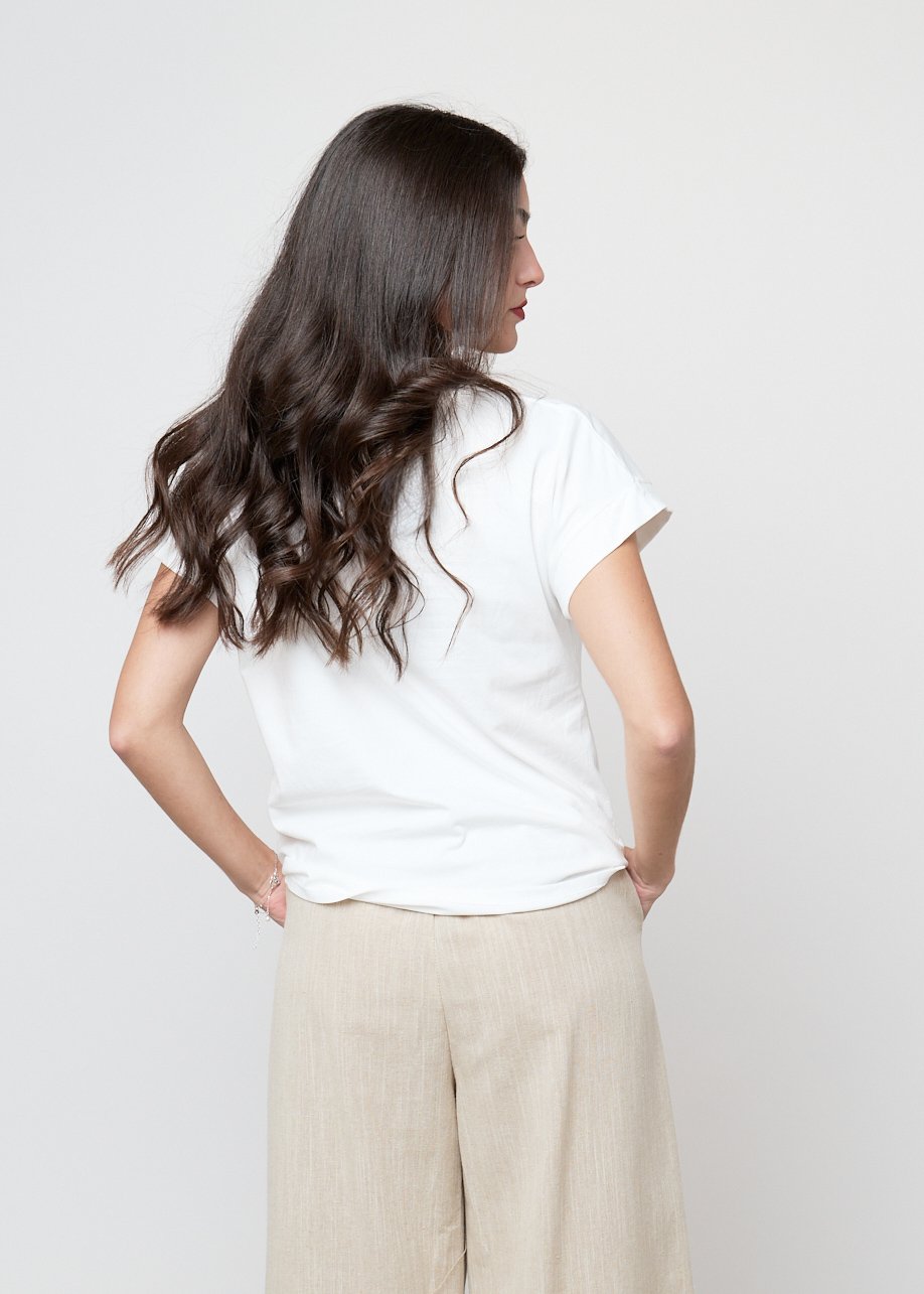 La Camiseta Seraphine combina fácilmente con pantalones fluidos, jeans o faldas, permitiendo crear estilismos casual chic equilibrados y modernos.