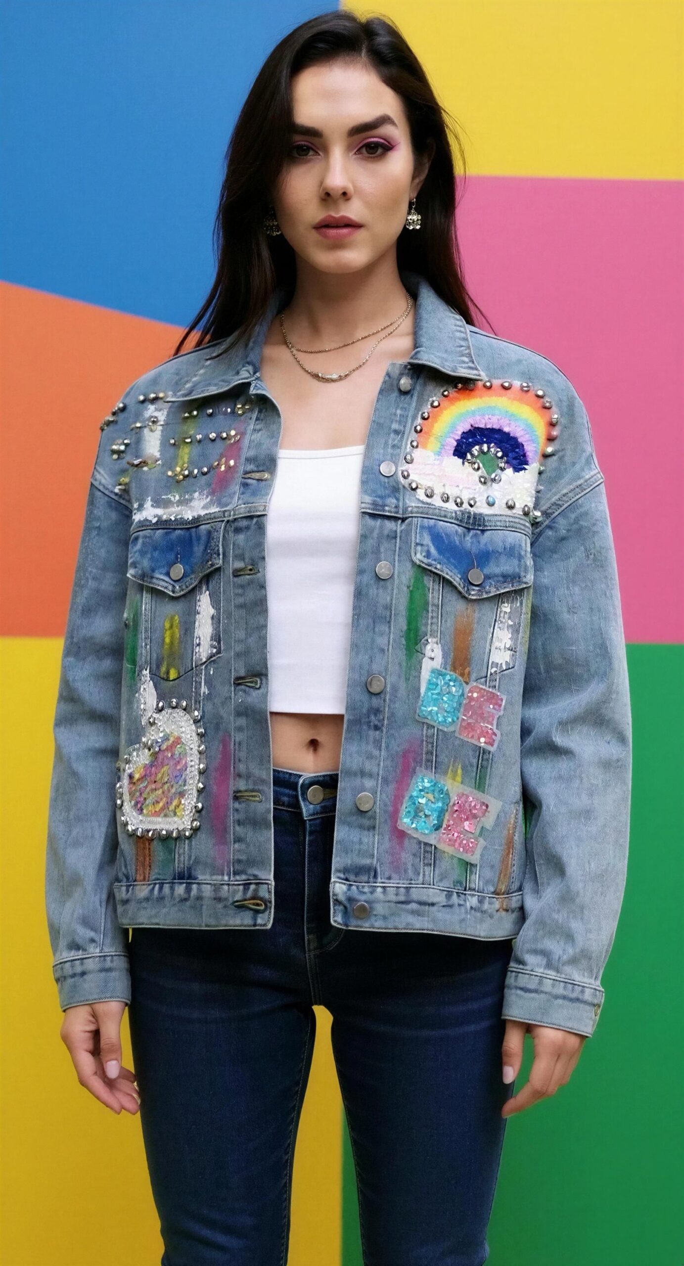 Los bordados coloridos, parches decorativos y aplicaciones metálicas aportan un aire artístico y moderno, transformando una cazadora vaquera tradicional en una prenda llena de carácter. Es perfecta para quienes buscan añadir un toque original a sus outfits.