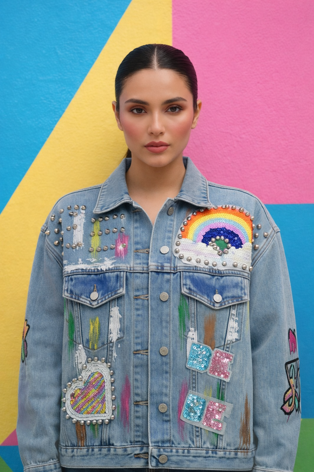 La Cazadora Denim Arcoíris es una prenda pensada para quienes aman los looks con personalidad. Esta chaqueta vaquera de mujer combina el estilo clásico del denim con detalles creativos que la convierten en una pieza única y muy llamativa.