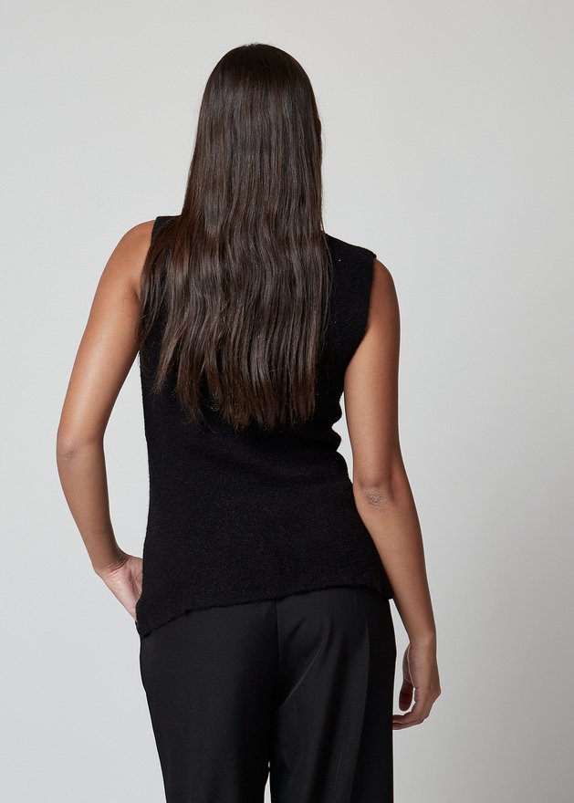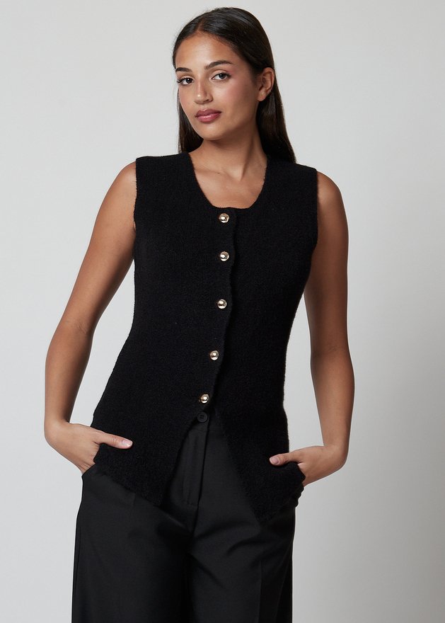 Chaleco negro sin mangas con botones dorados. Elegante, versátil y perfecto para looks casuales y sofisticados.