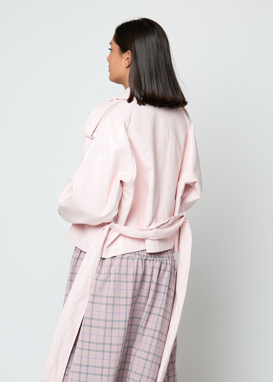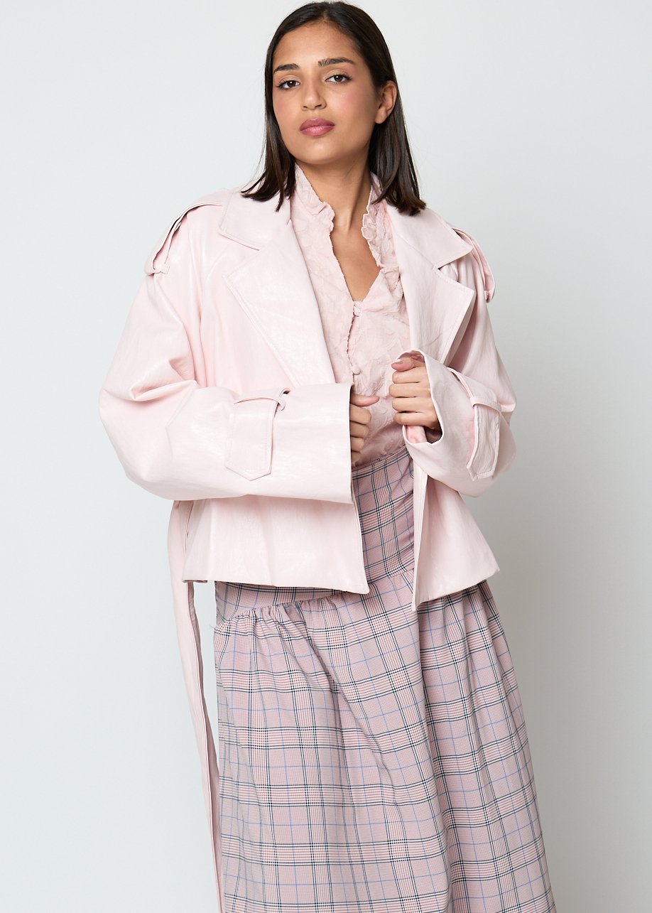 Chaqueta rosa con cinturón ajustable y corte fluido. Elegante, cómoda y perfecta para looks casuales femeninos.