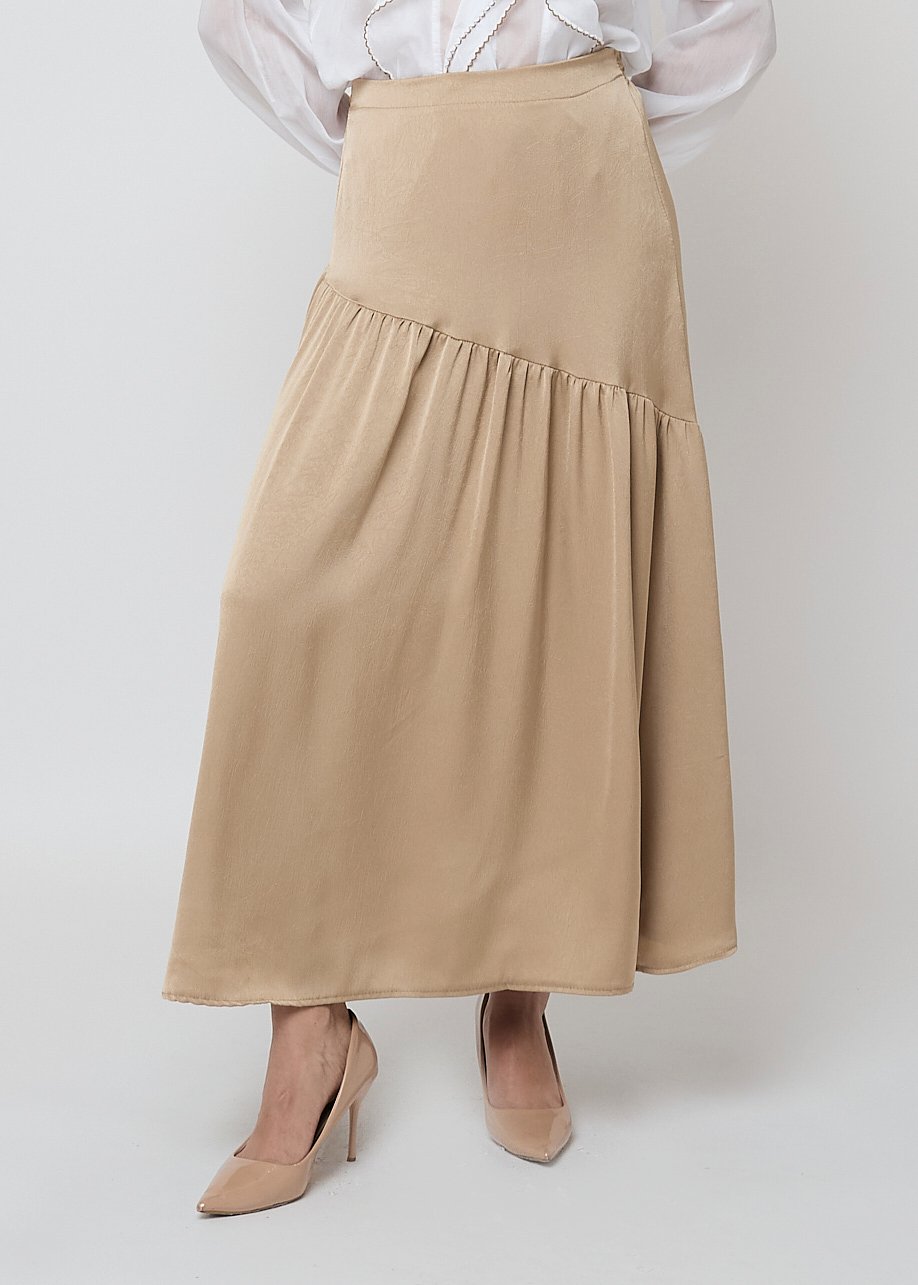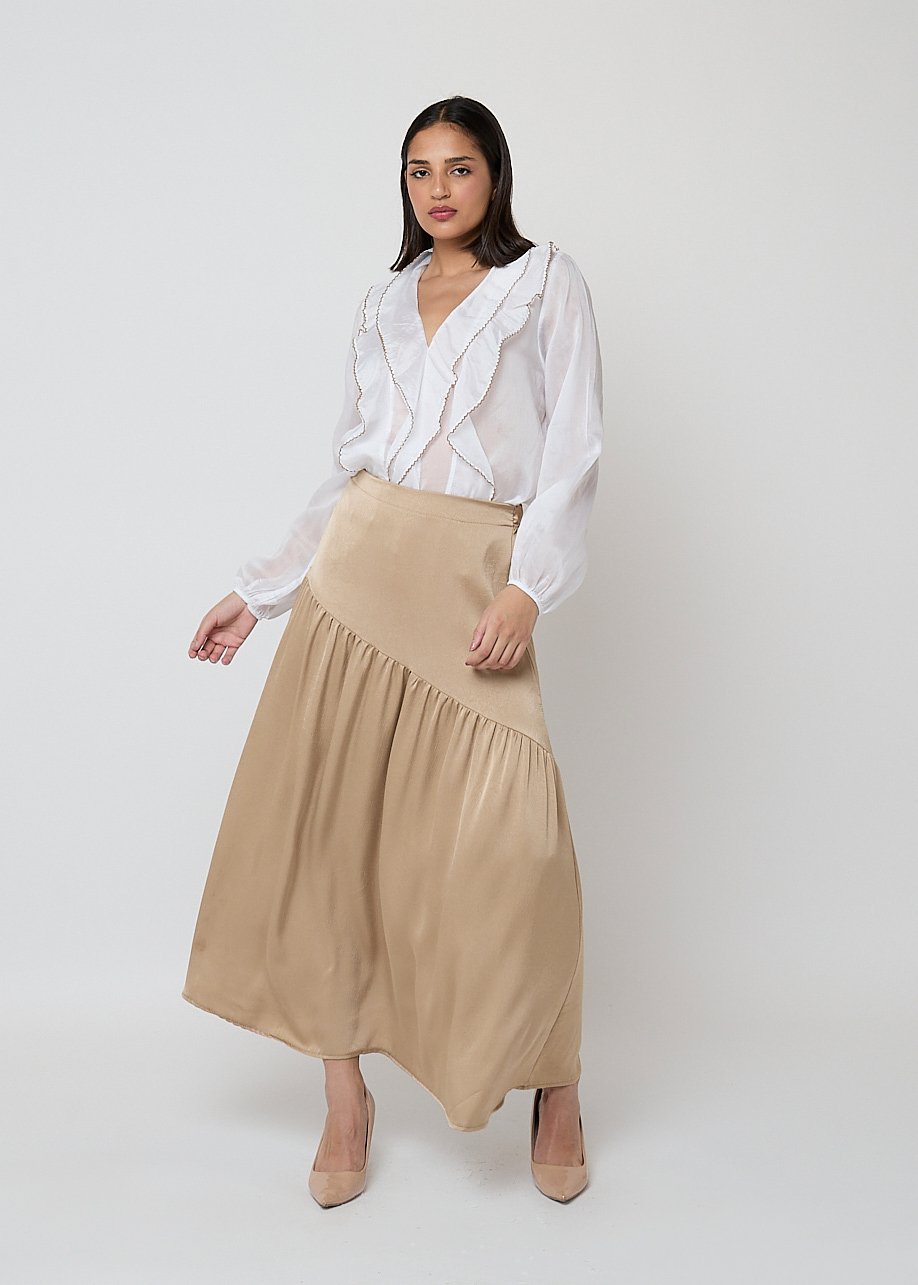 Falda midi beige fluida con corte asimétrico. Elegante, versátil y perfecta para looks femeninos de día.