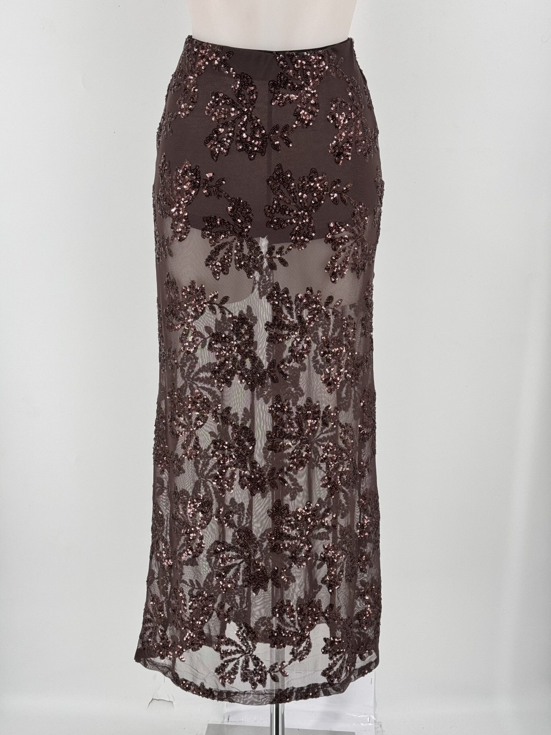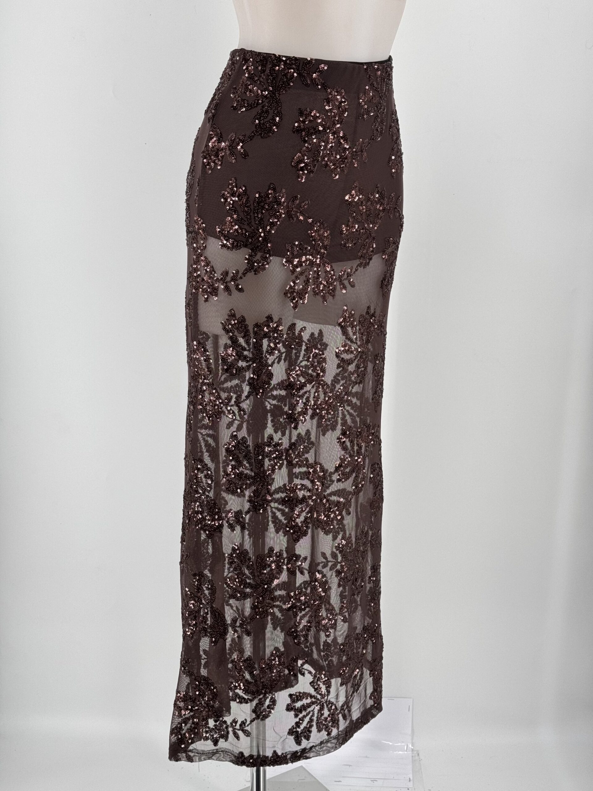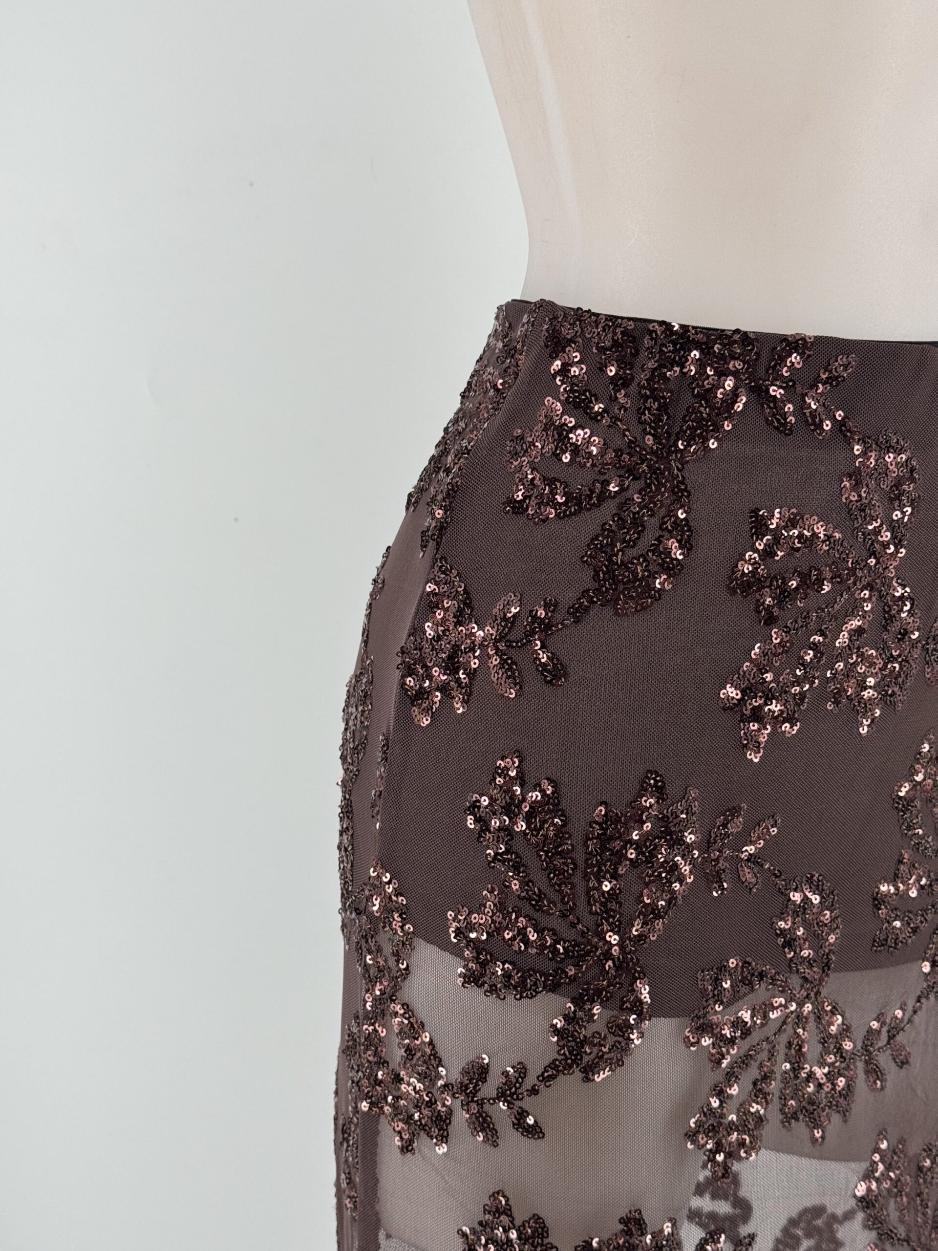 La Falda Broncea combina transparencias y lentejuelas en un diseño elegante y moderno, ideal para tus noches más especiales.