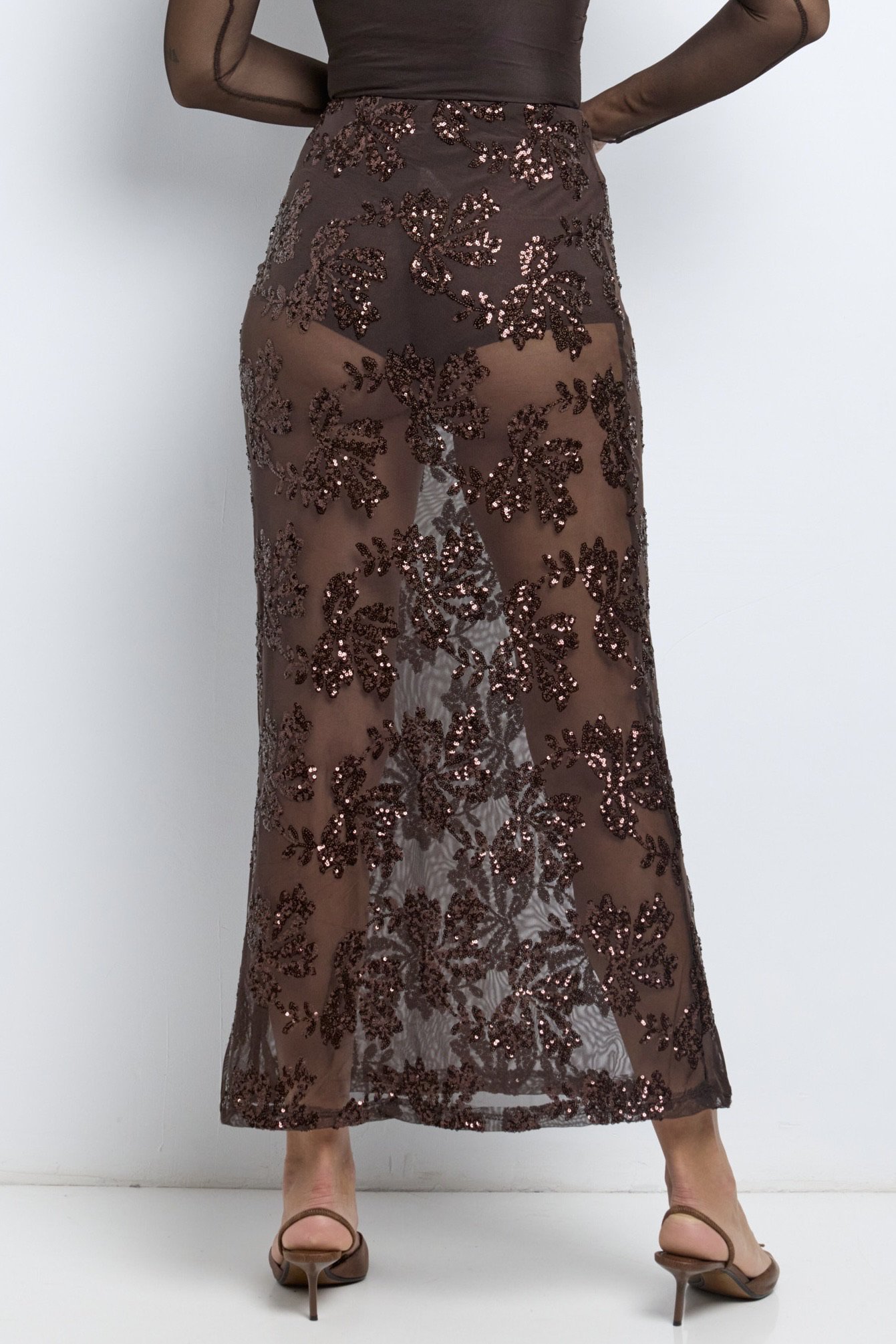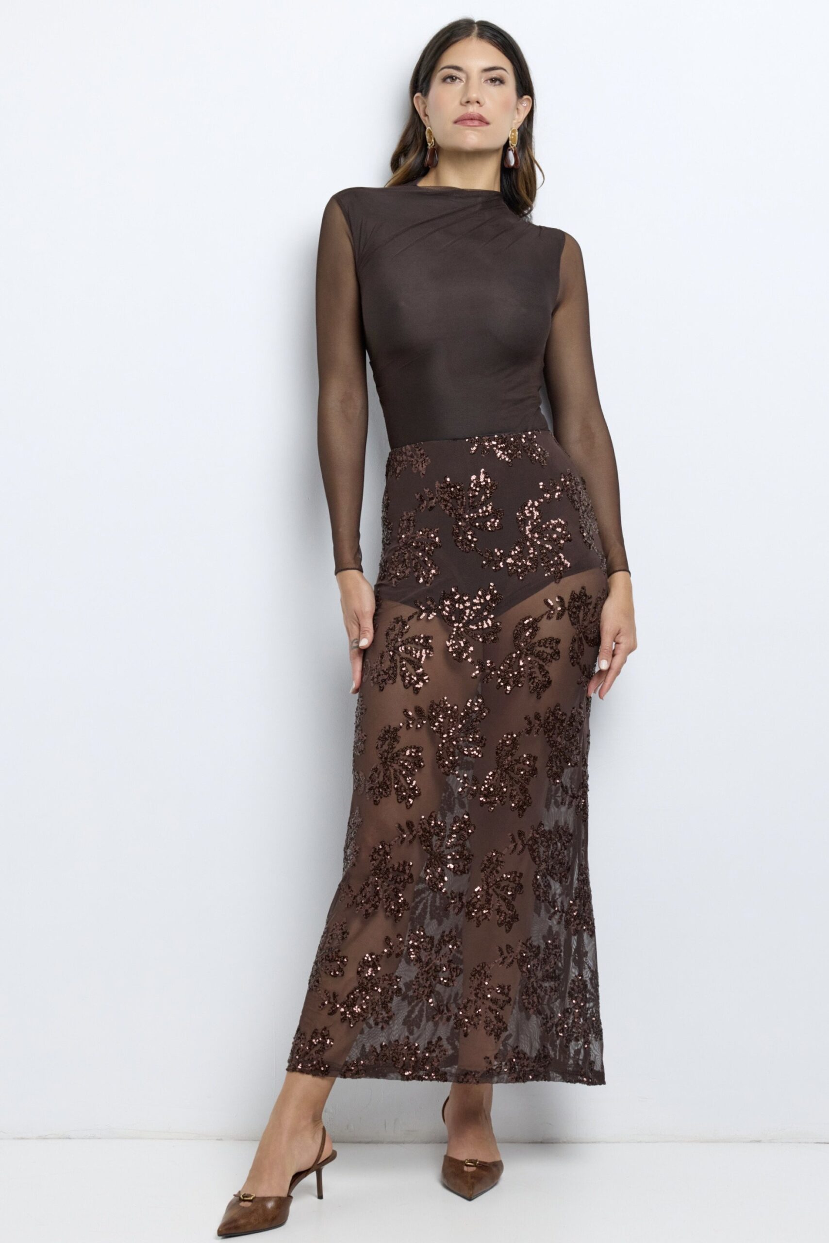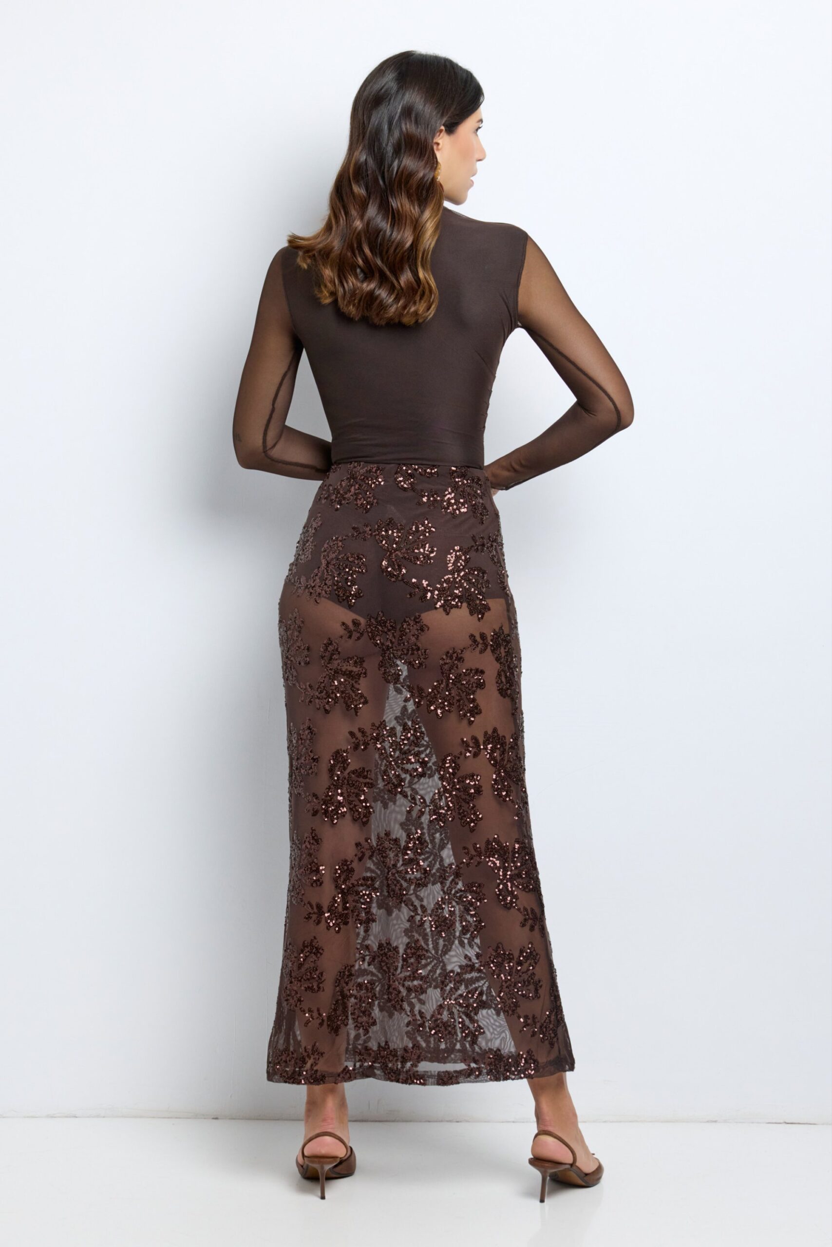 La Falda Broncea combina transparencias y lentejuelas en un diseño elegante y moderno, ideal para tus noches más especiales.
