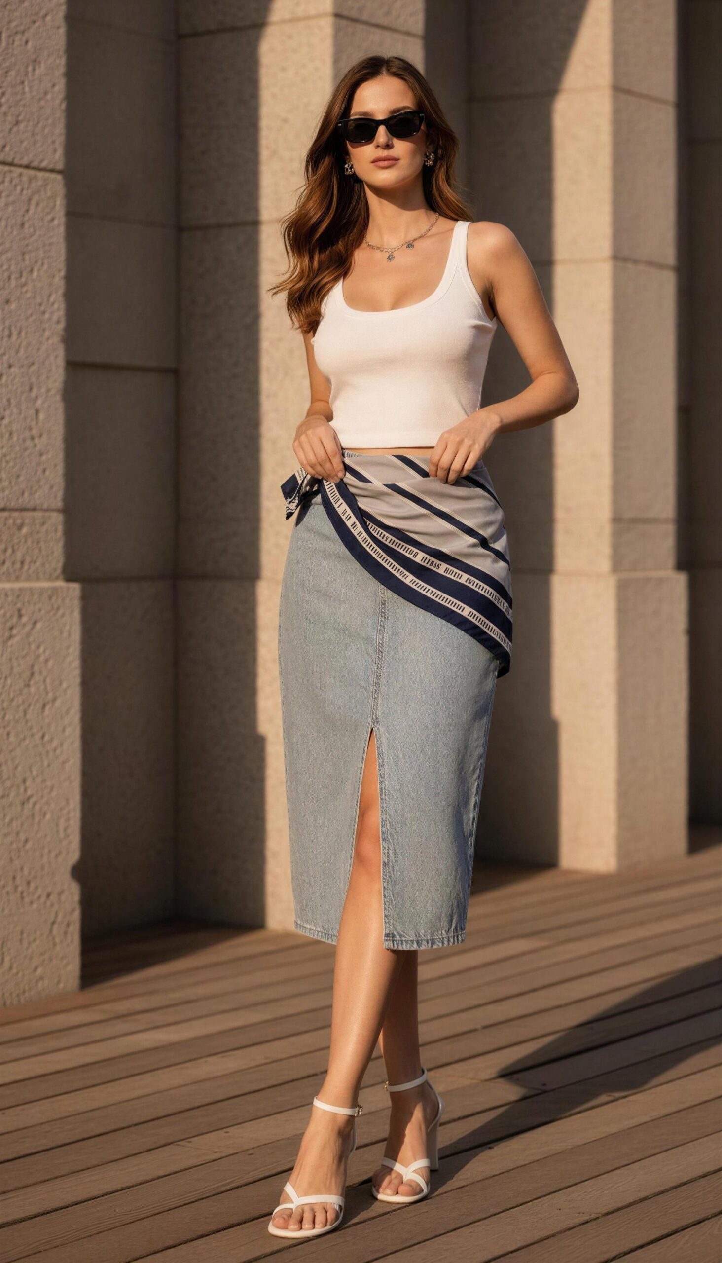 Esta falda vaquera midi de mujer es ideal para crear looks casual chic llenos de estilo. Combina perfectamente con tops ajustados, camisetas básicas o blusas románticas, adaptándose tanto a estilismos de día como a outfits más elegantes.