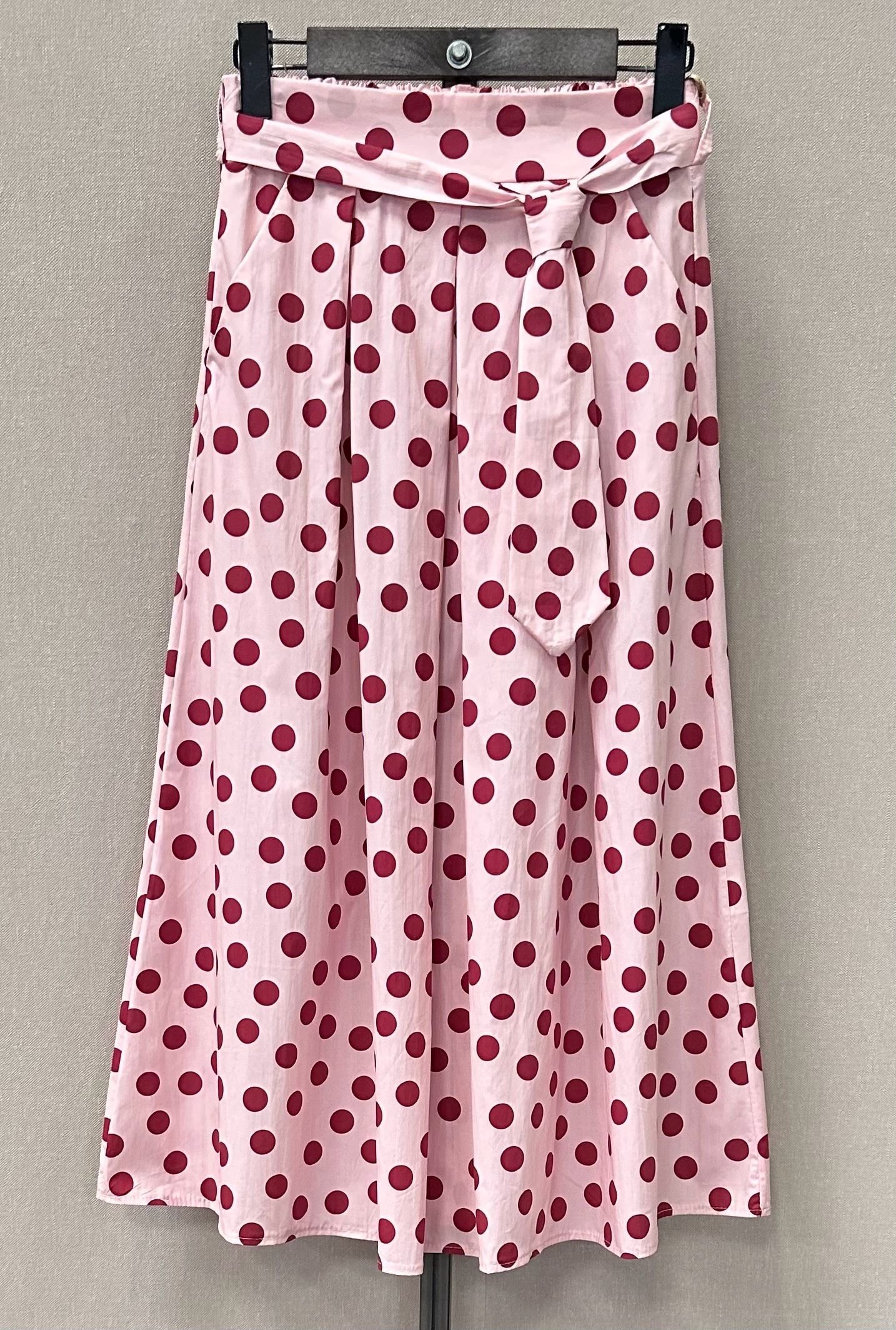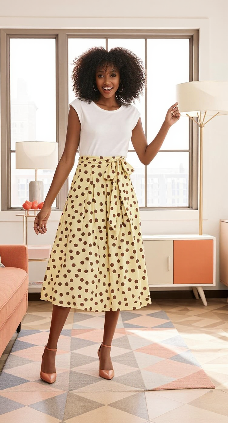 Falda midi casual de lunares con cintura alta y lazada. Ligera, femenina y perfecta para primavera verano 2026.