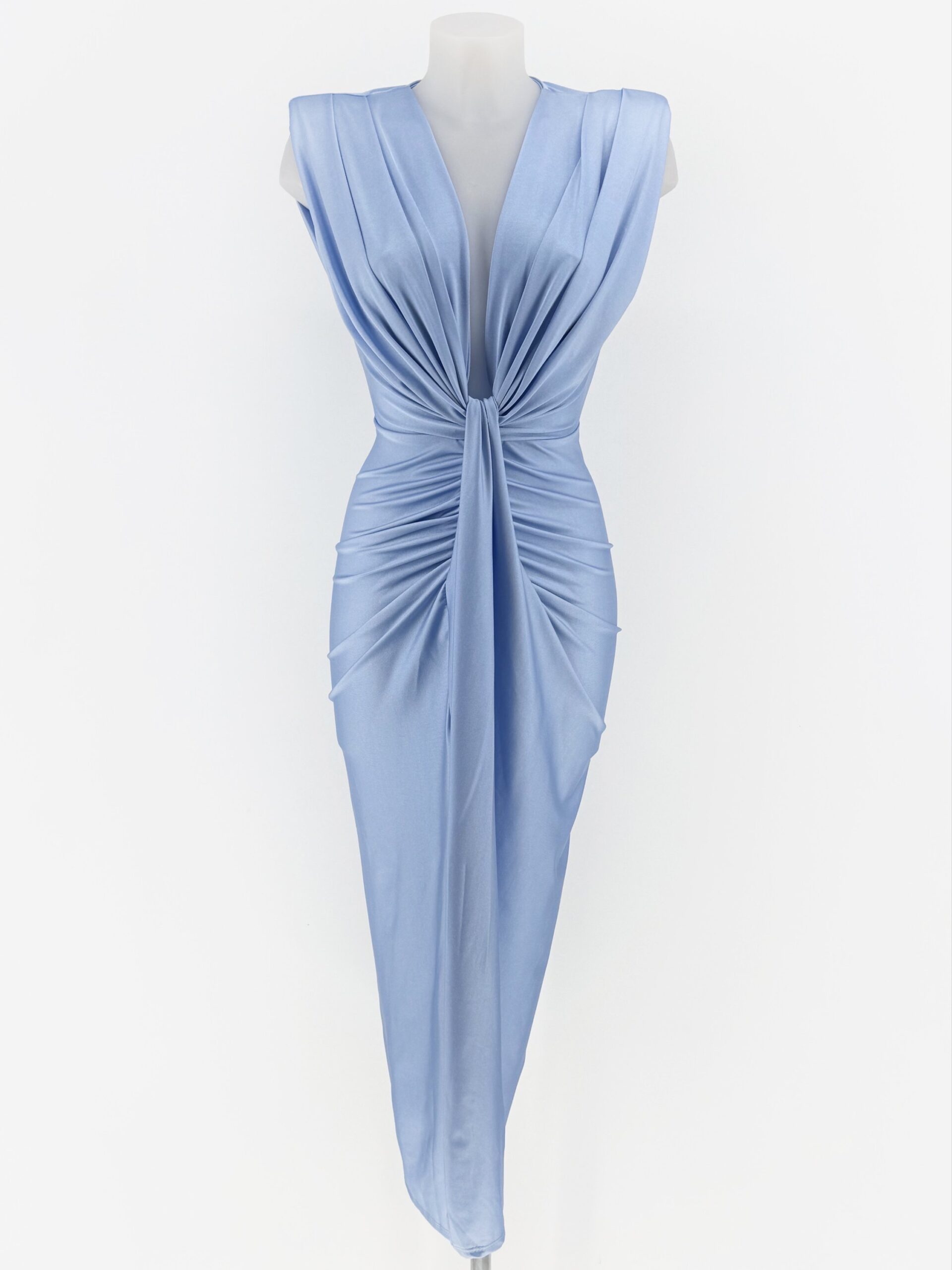 Vestido largo celeste para eventos con escote profundo drapeado y abertura frontal. Elegante, femenino y muy favorecedor.