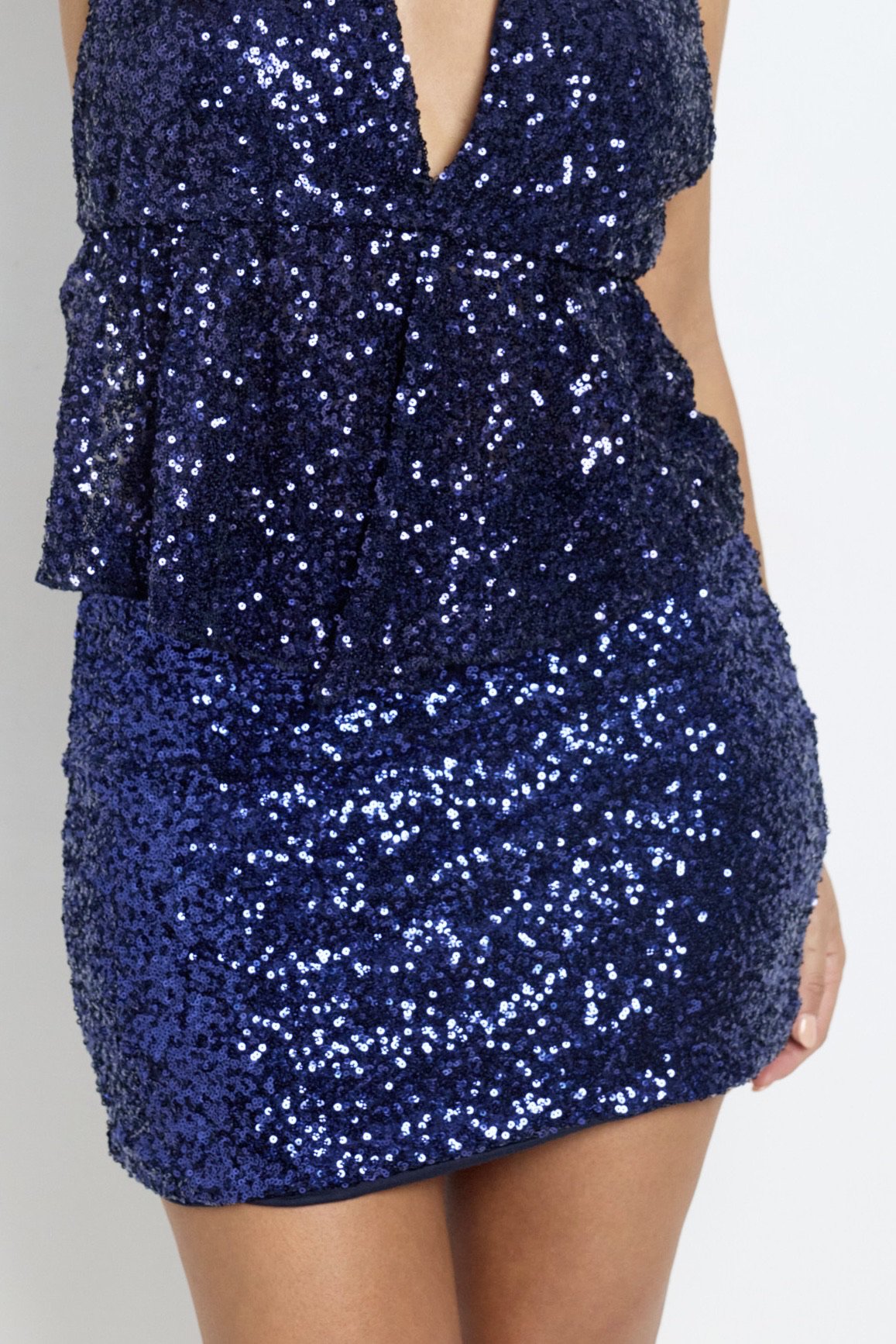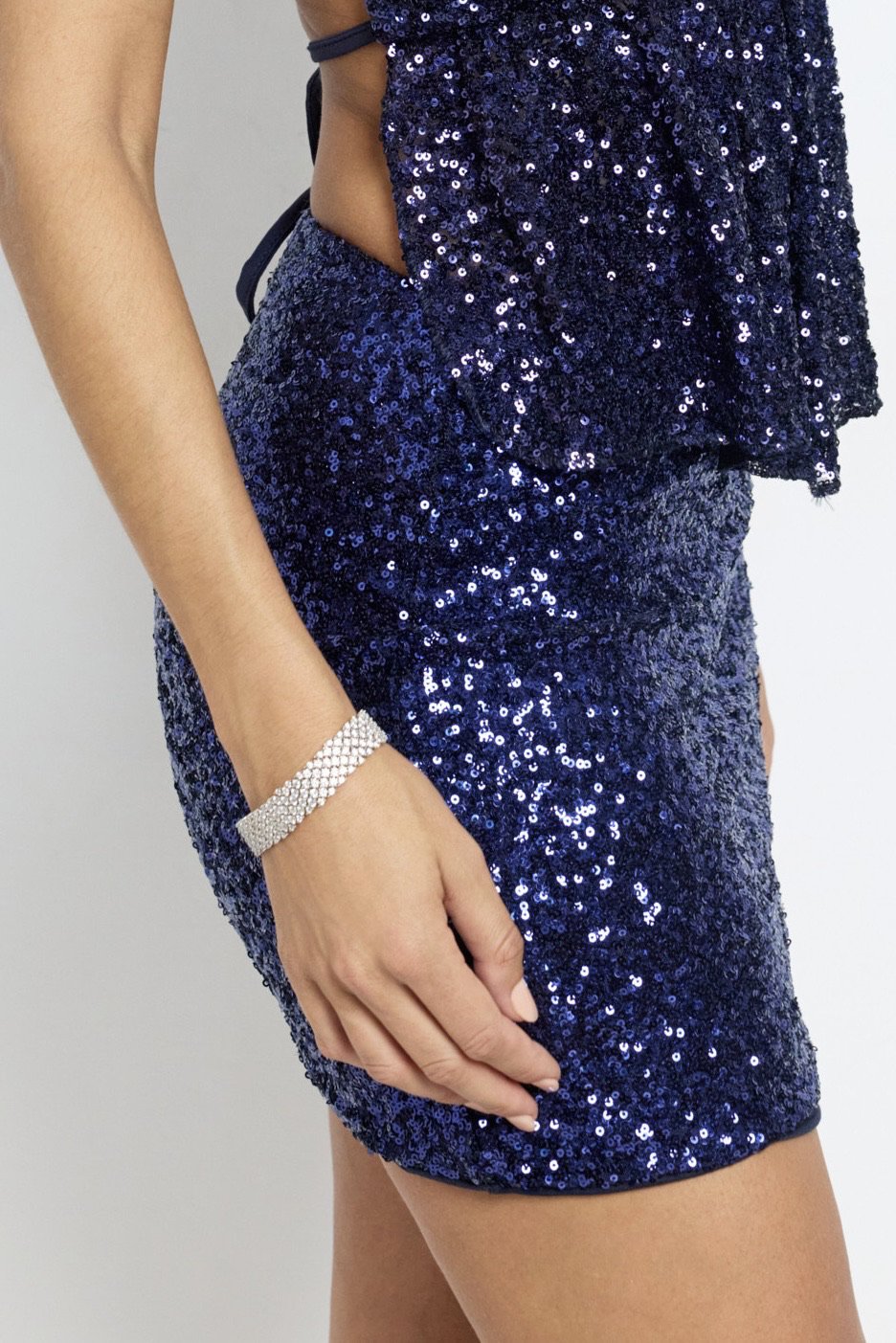 La Falda Lyra deslumbra con su brillo azul noche y corte mini, perfecta para un look de fiesta moderno y atrevido.