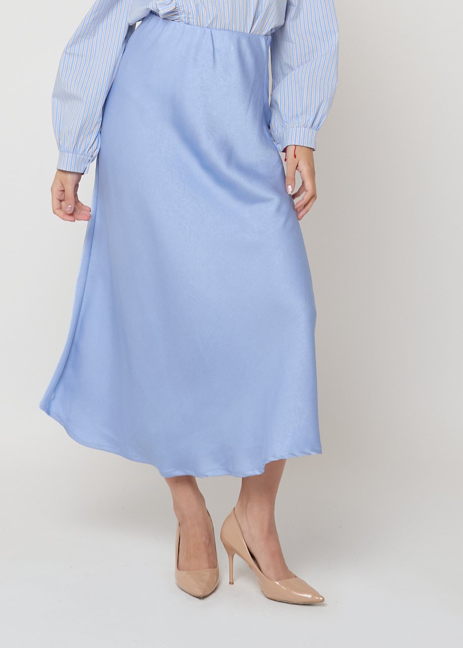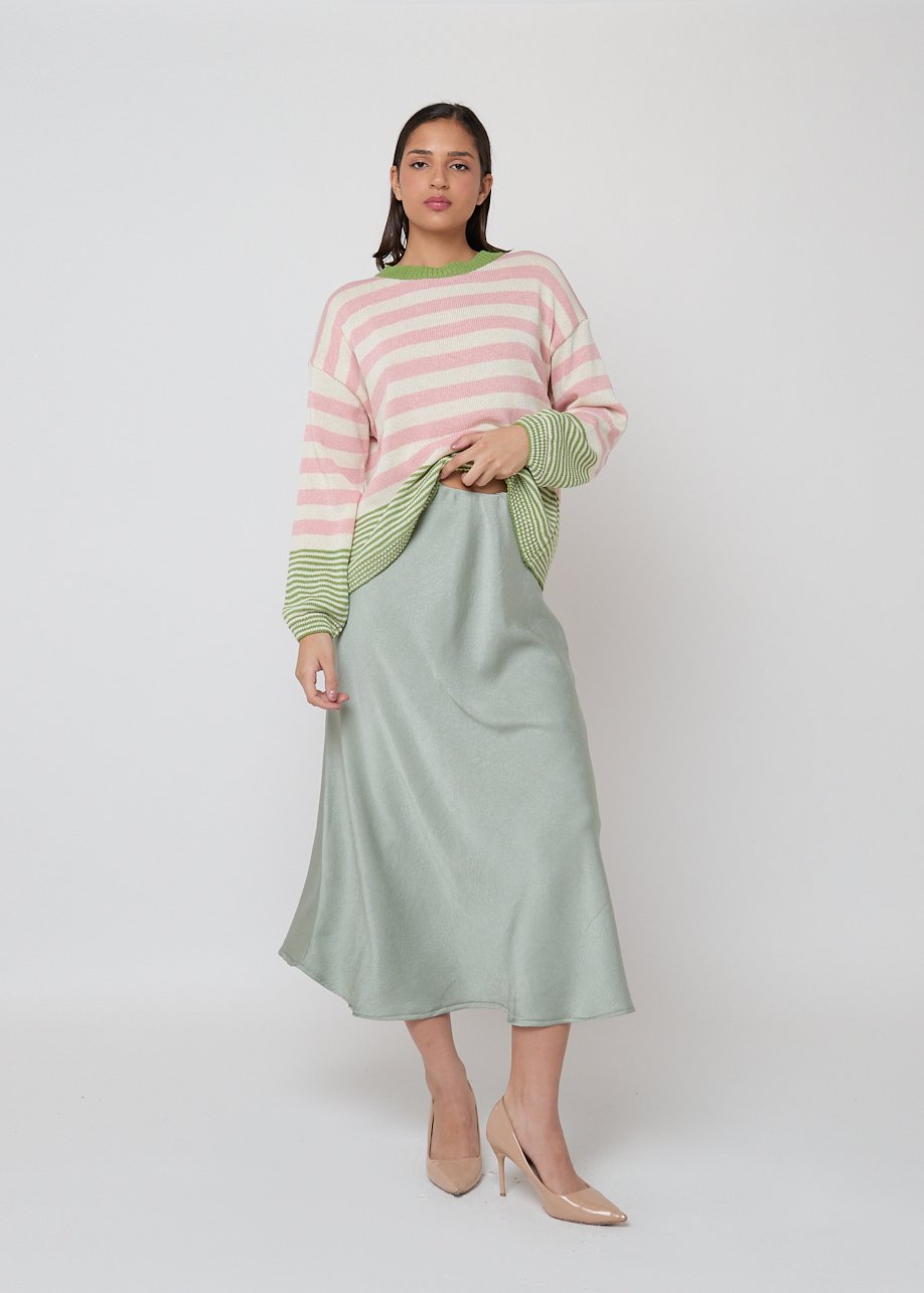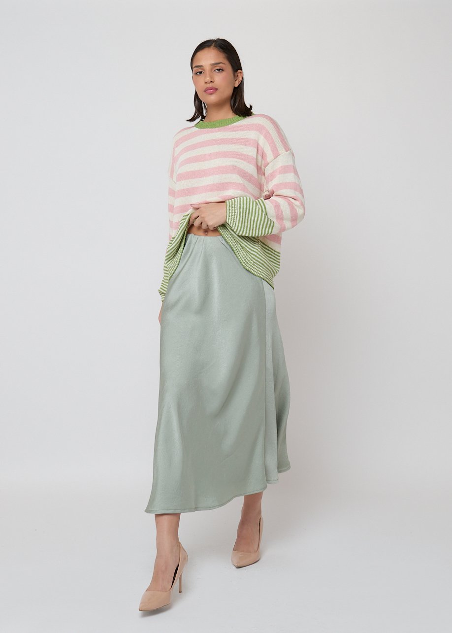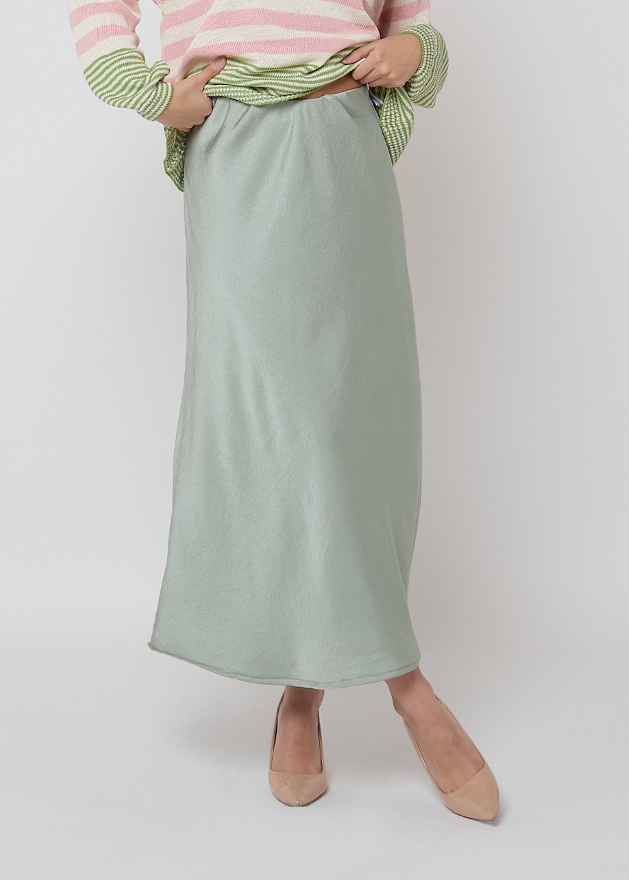 Falda midi satinada en verde salvia o azul pastel. Fluida, elegante y perfecta para looks casual chic.