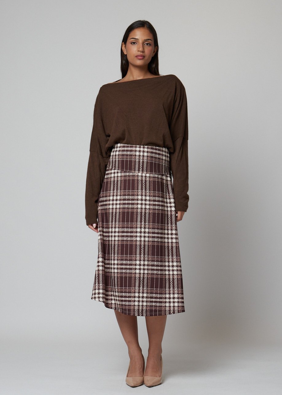 Falda midi de cuadros burdeos y beige. Elegante, cómoda y fácil de combinar con jerséis o camisas.