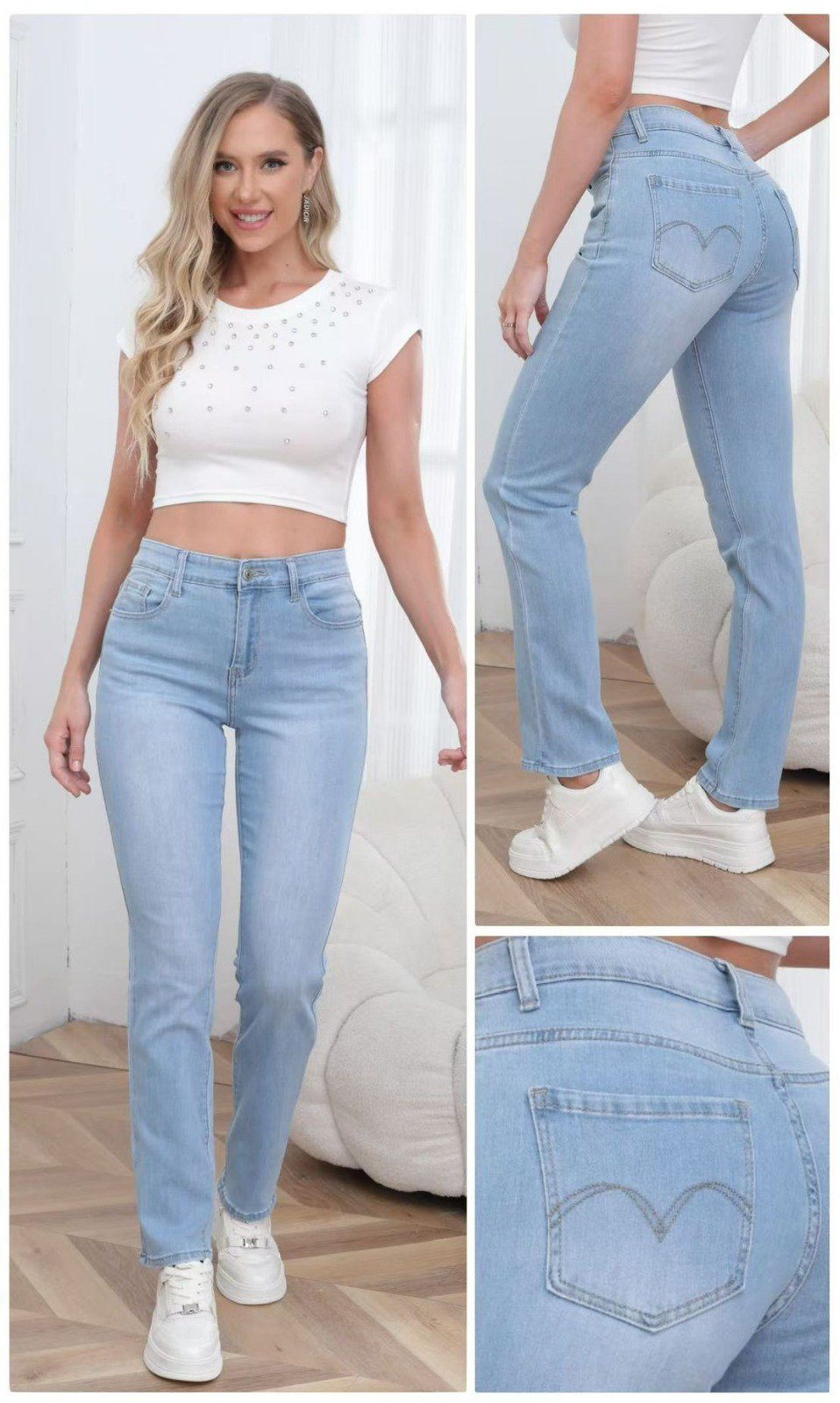 Jeans azules de corte recto con delicado detalle de corazón en los bolsillos traseros. Femeninos, cómodos y muy favorecedores.