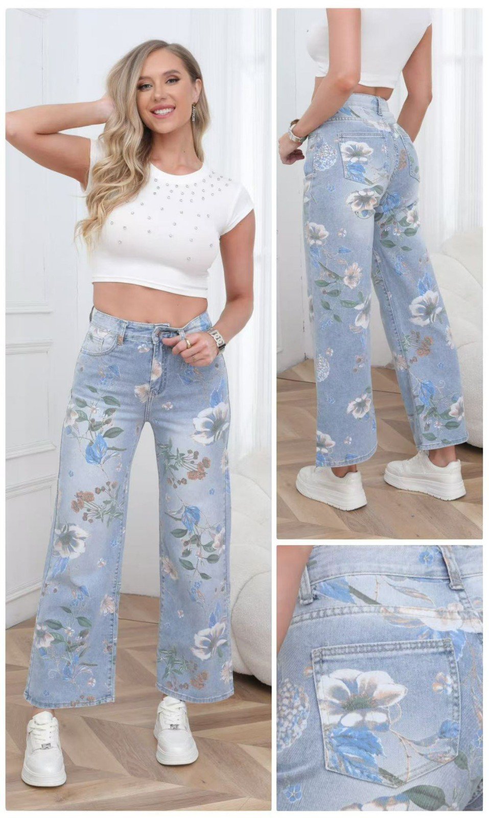 Jeans rectos con delicado estampado floral. Femeninos, cómodos y perfectos para looks casual con aire romántico.