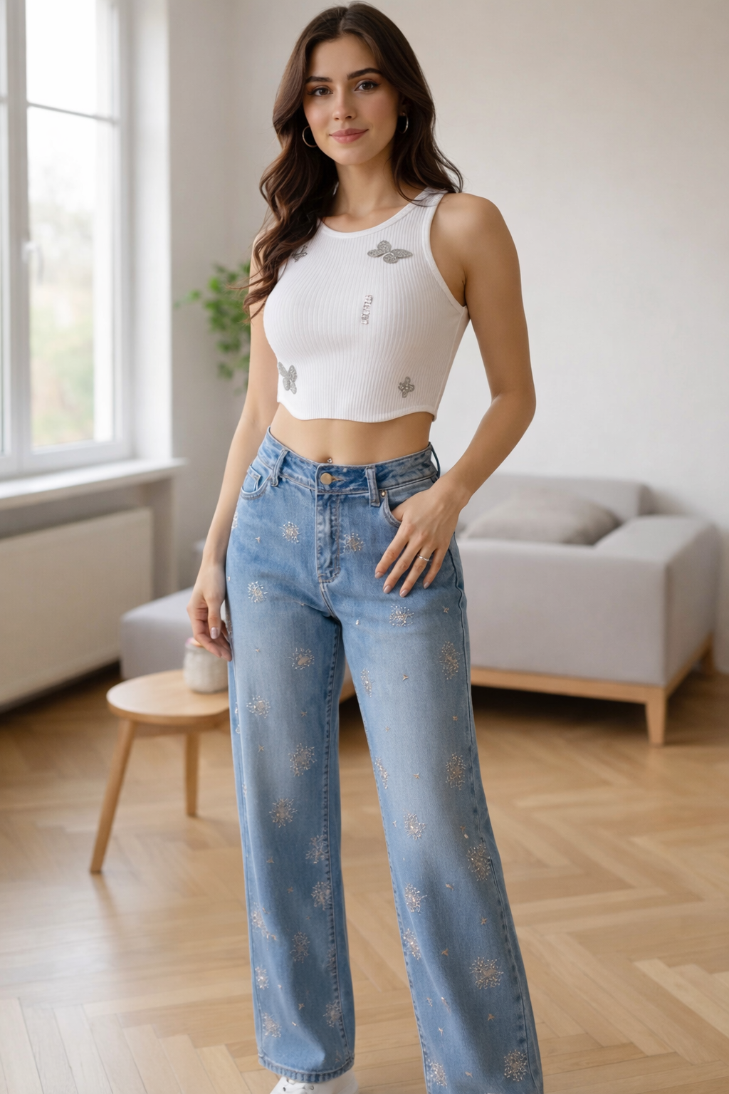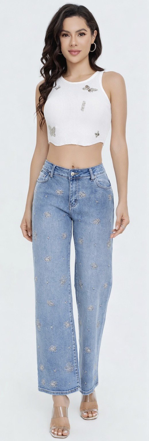 Jeans rectos con delicados bordados florales. Cómodos, femeninos y perfectos para looks casual con un toque especial.