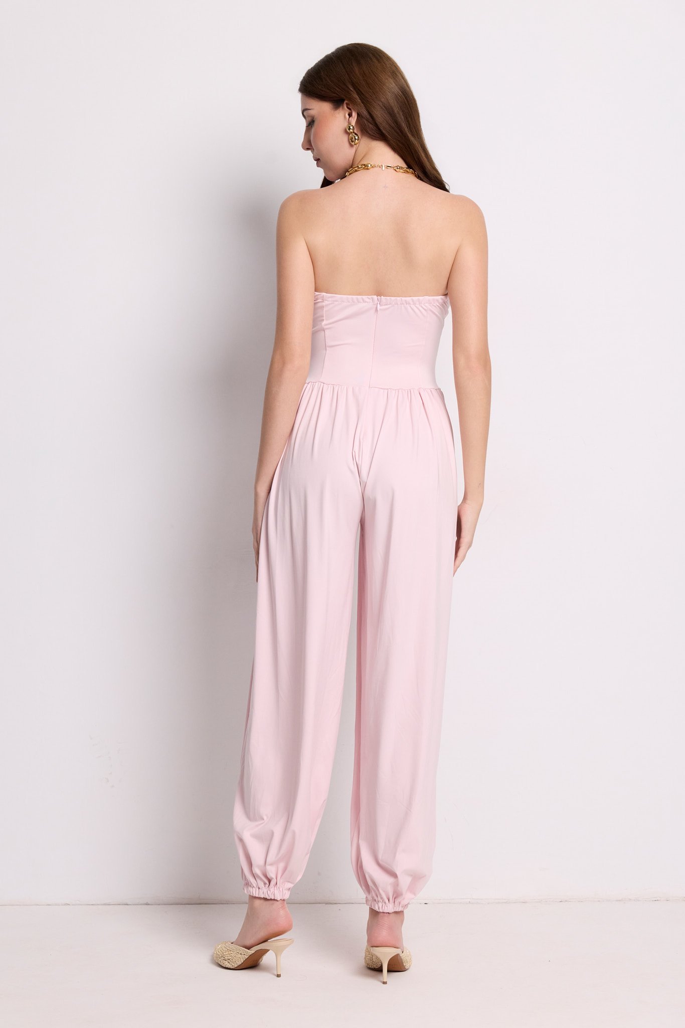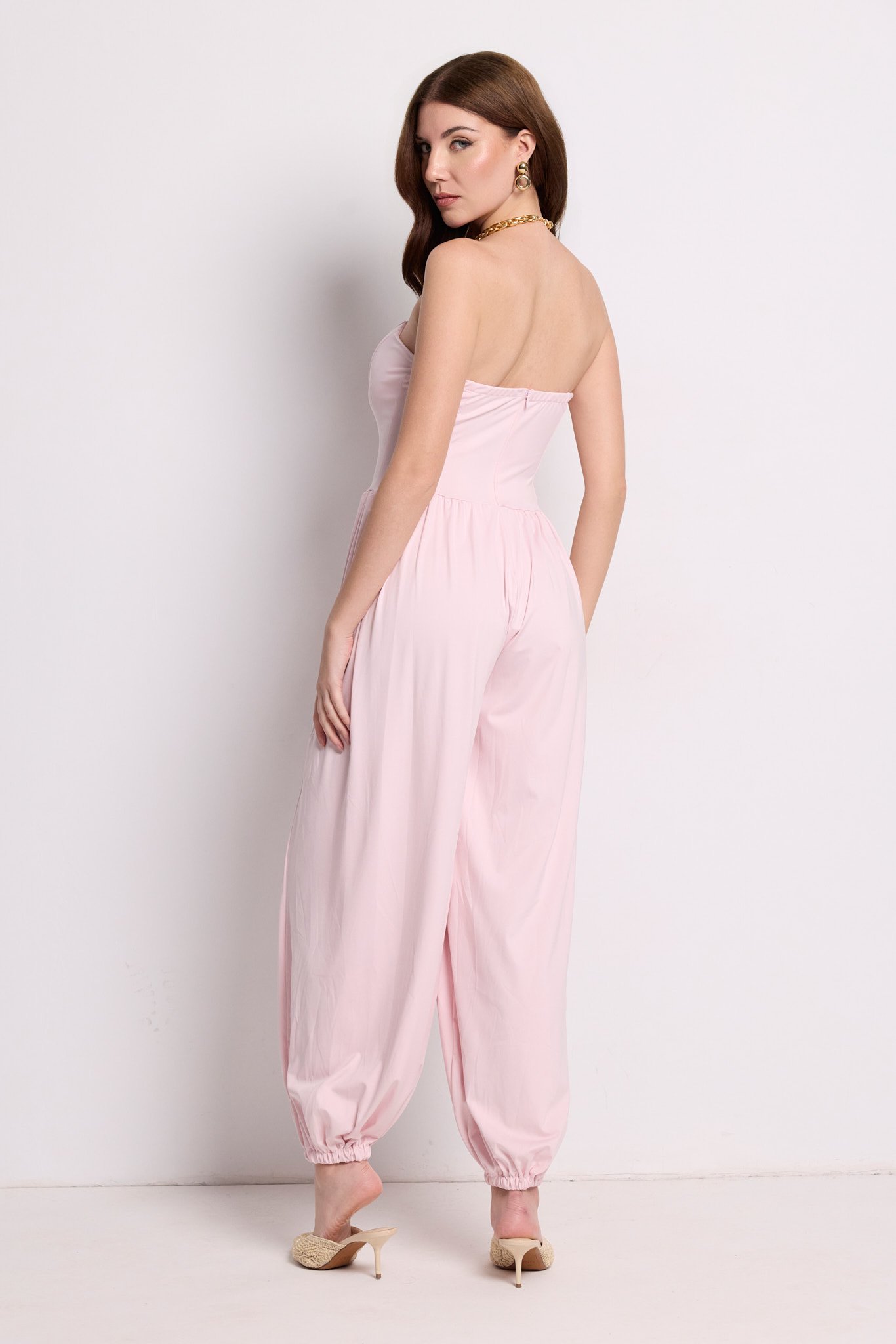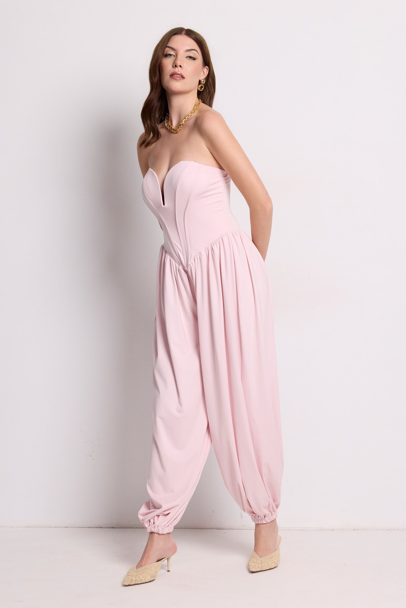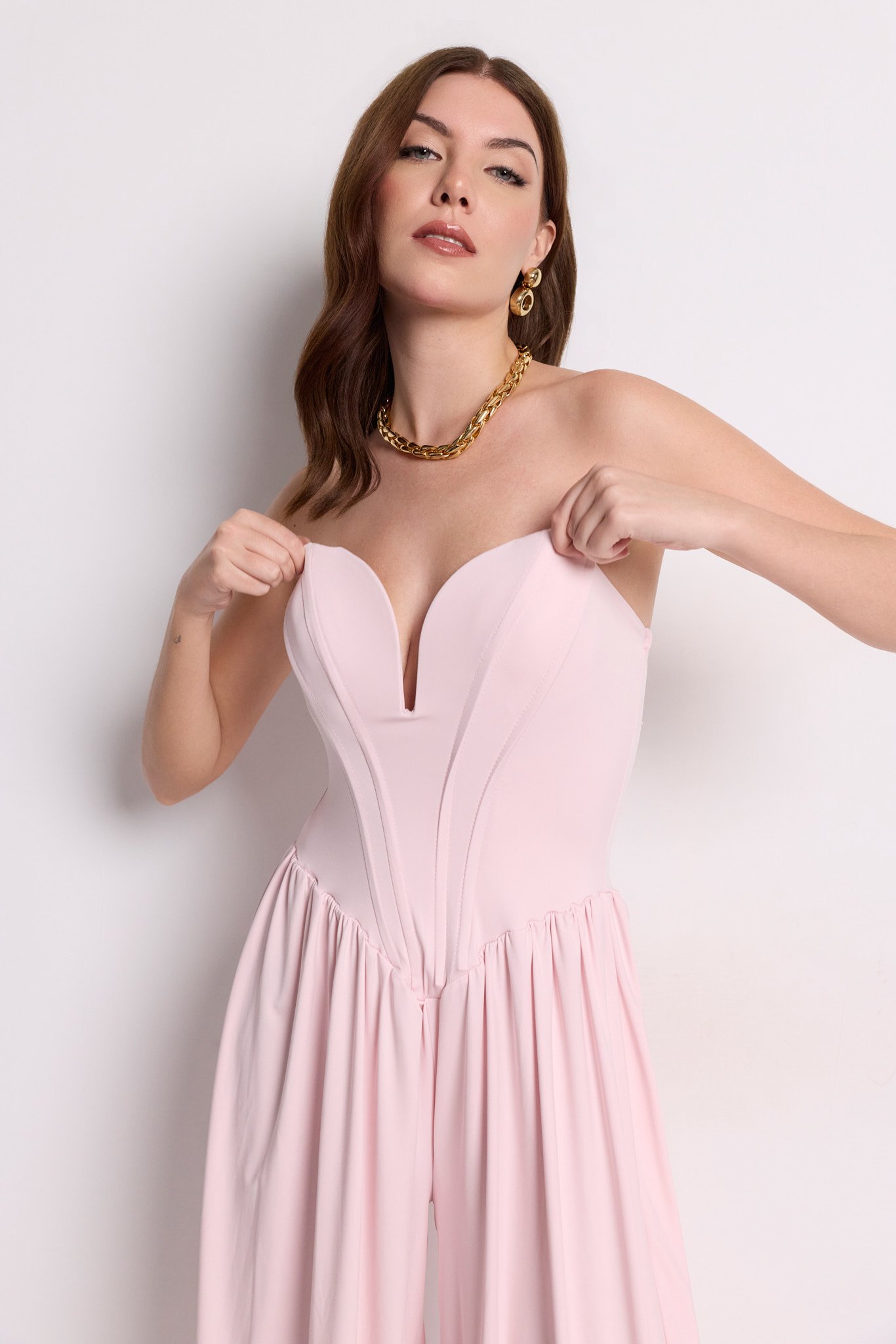 Mono elegante rosa con escote bustier y pantalón fluido. Perfecto para invitadas y eventos especiales.