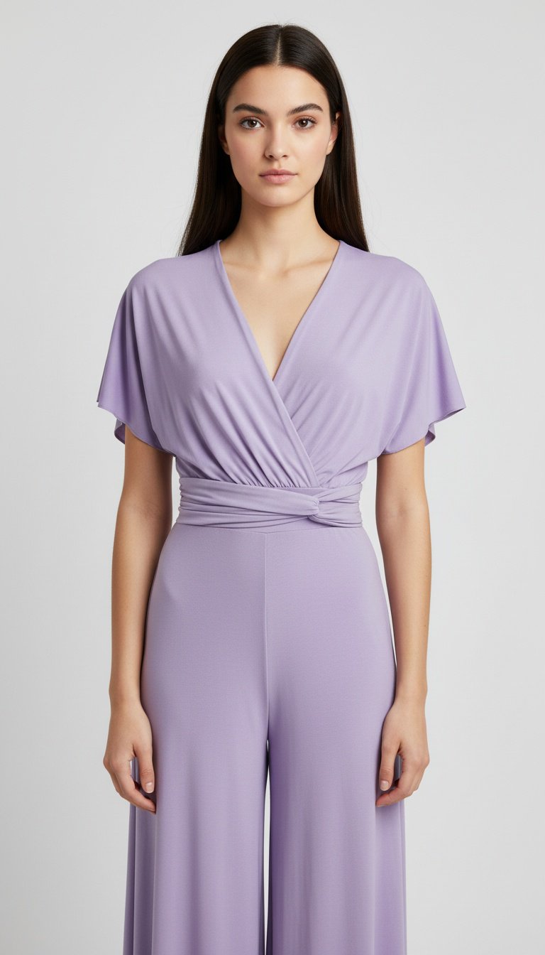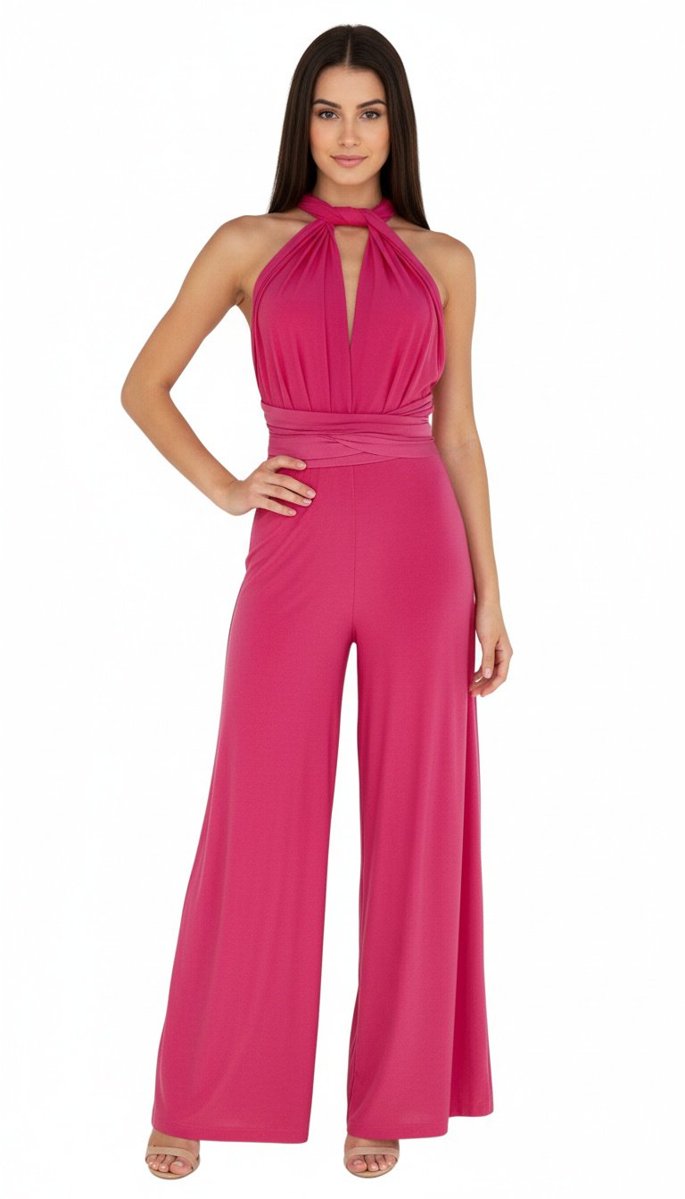 Gracias a su escote ajustable, puedes llevarlo tipo halter, cruzado o anudado, adaptándolo a tu estilo personal y al tipo de celebración. La cintura drapeada estiliza la silueta, mientras que el pantalón largo y fluido alarga visualmente las piernas y aporta un movimiento elegante al caminar.