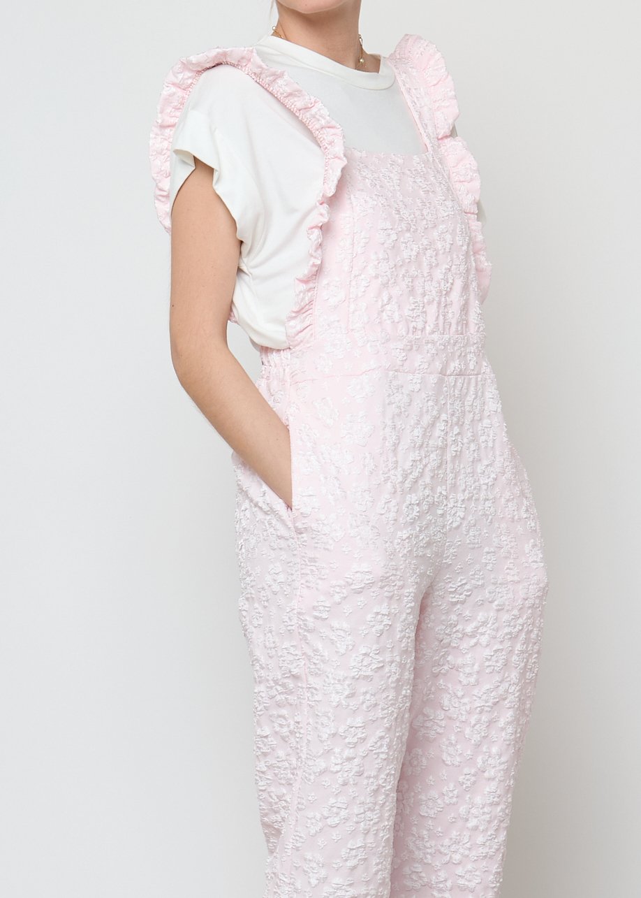 Mono largo rosa con textura floral y tirantes con volante. Femenino, cómodo y perfecto para looks casual chic.