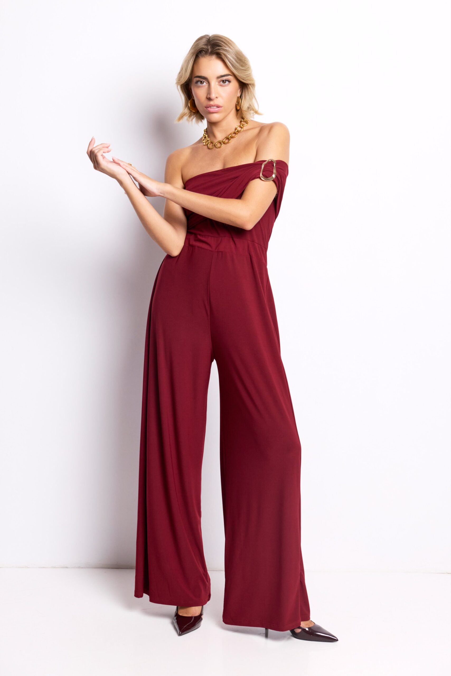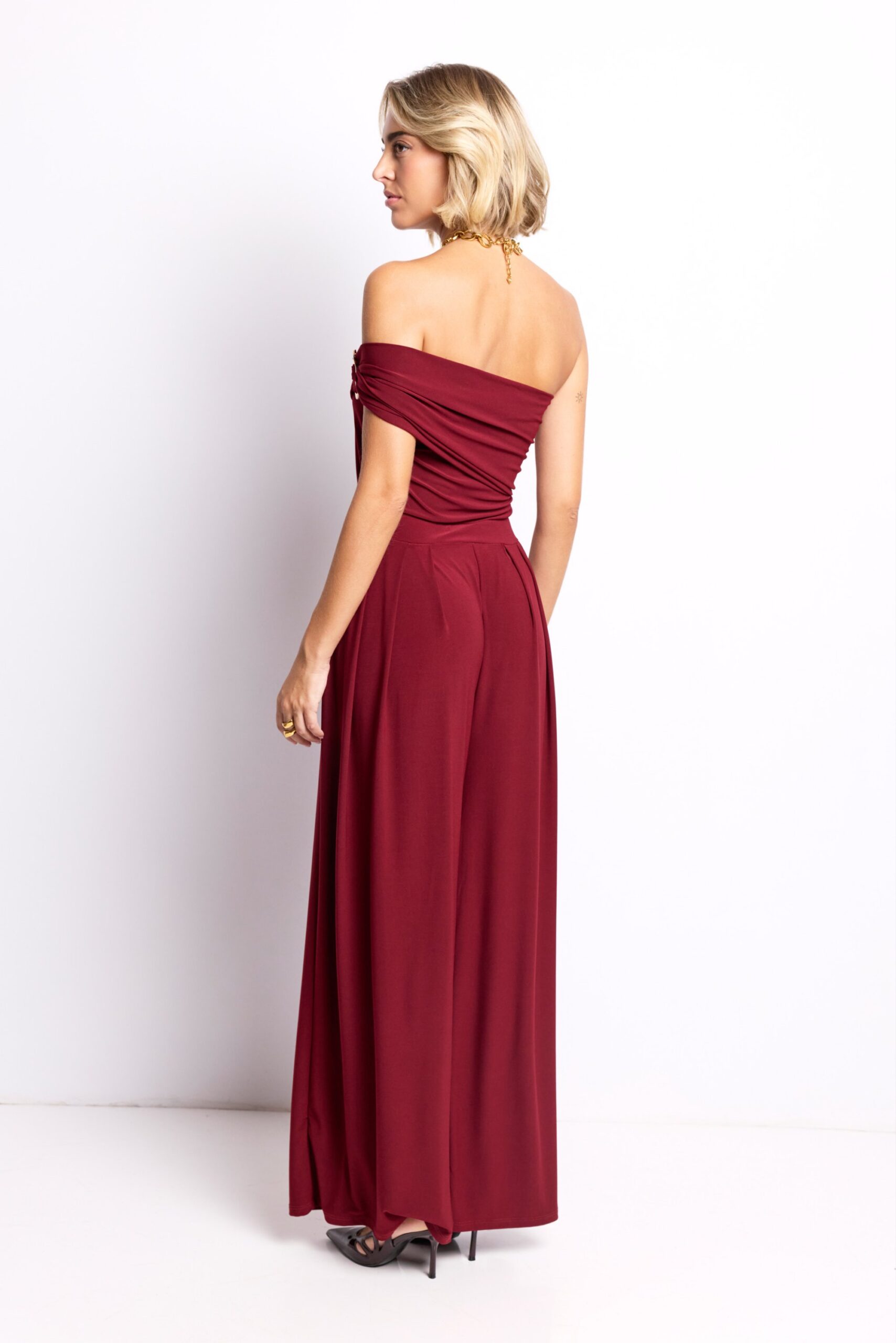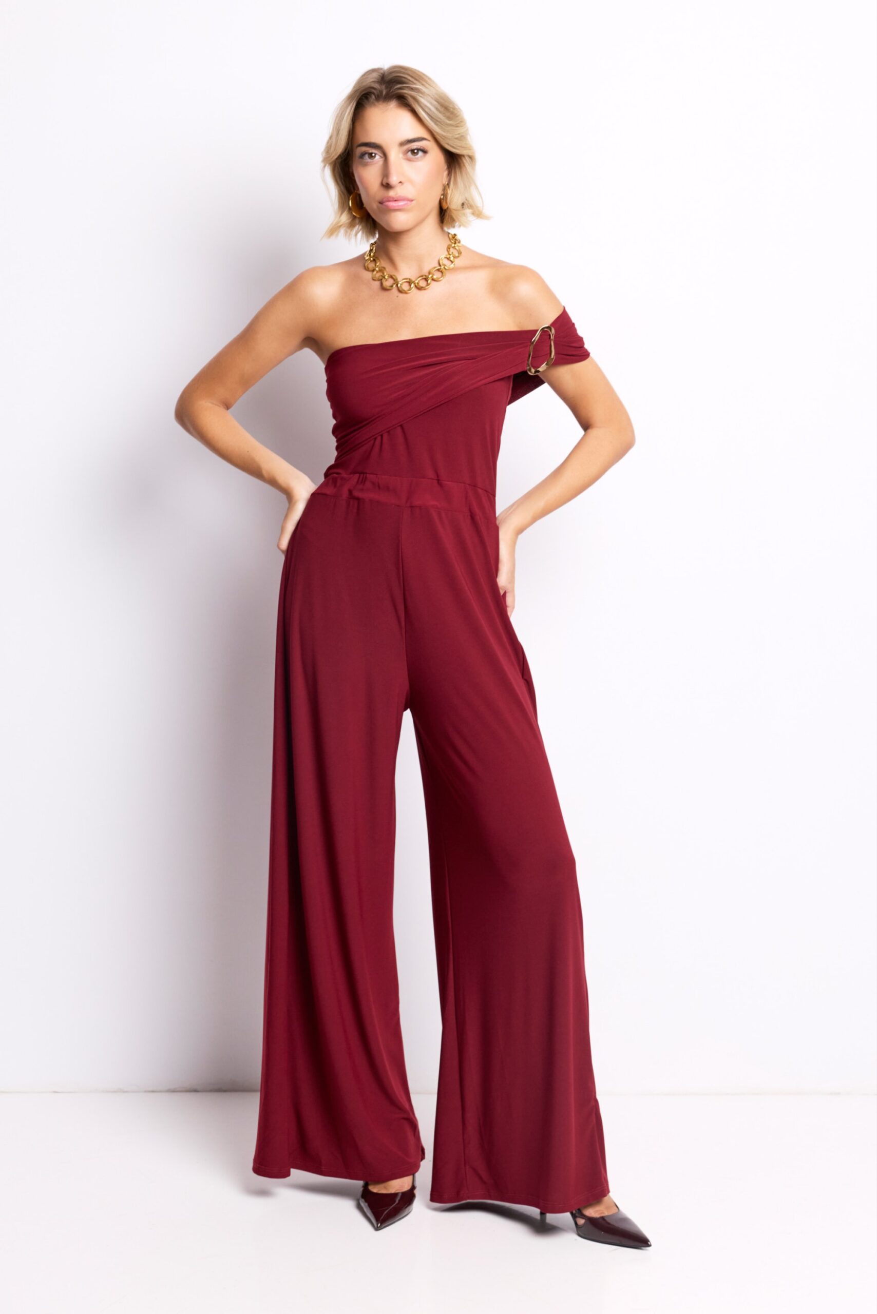 El Mono Elara es la definición de elegancia sin esfuerzo. Su tono burdeos intenso transmite carácter y feminidad, mientras que el detalle dorado en el hombro añade un punto de brillo sofisticado.