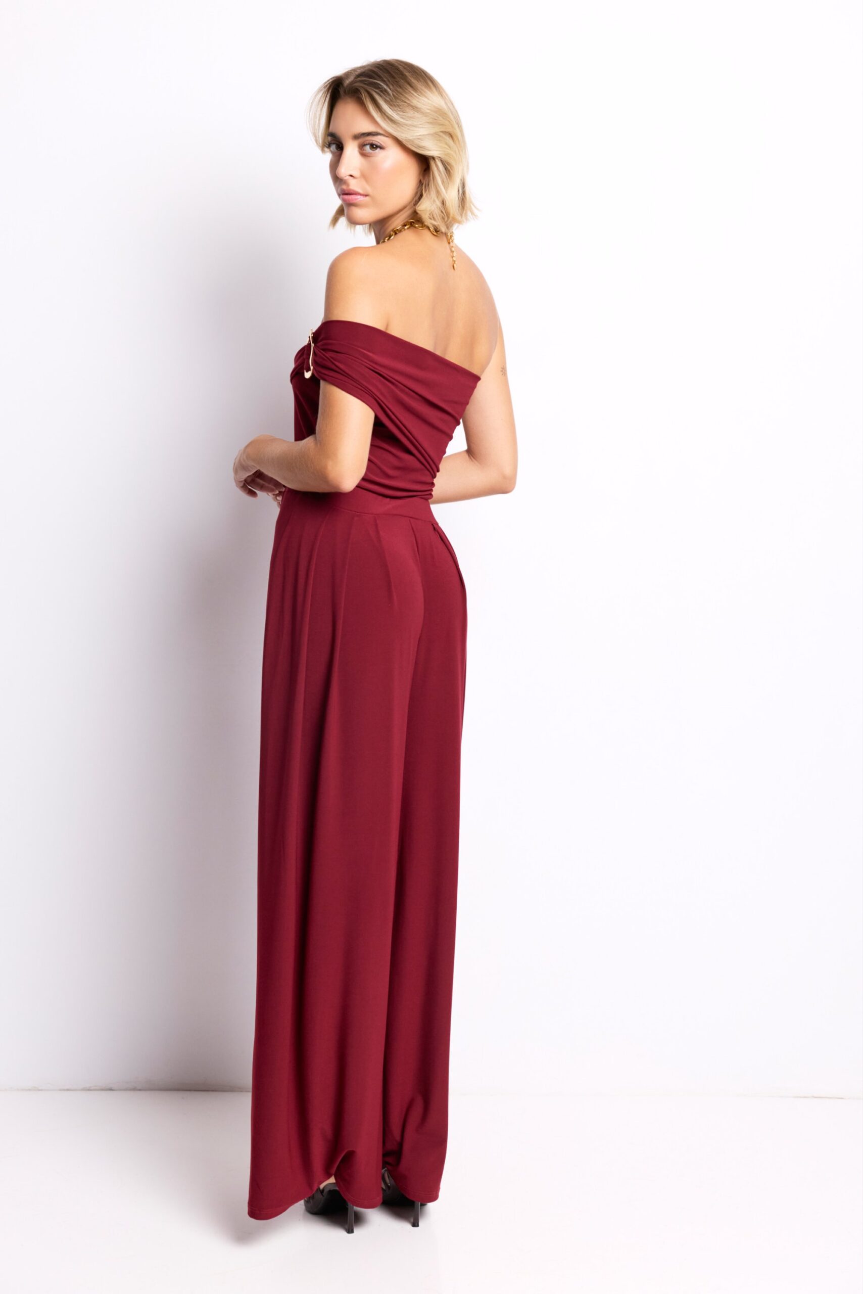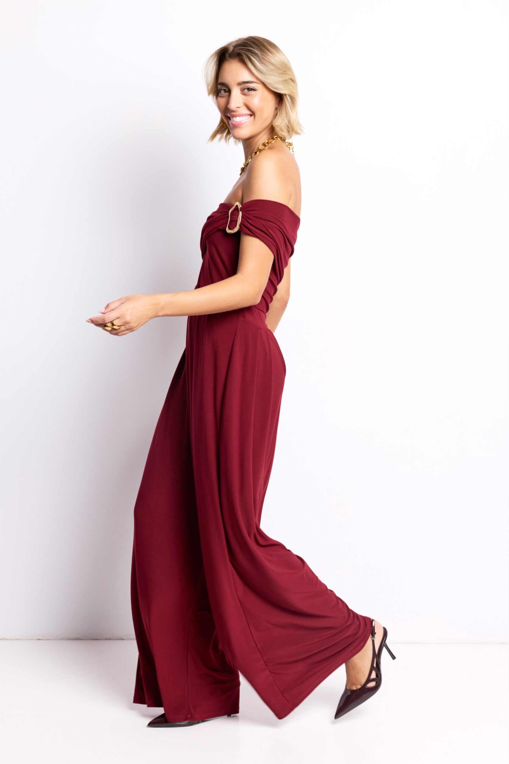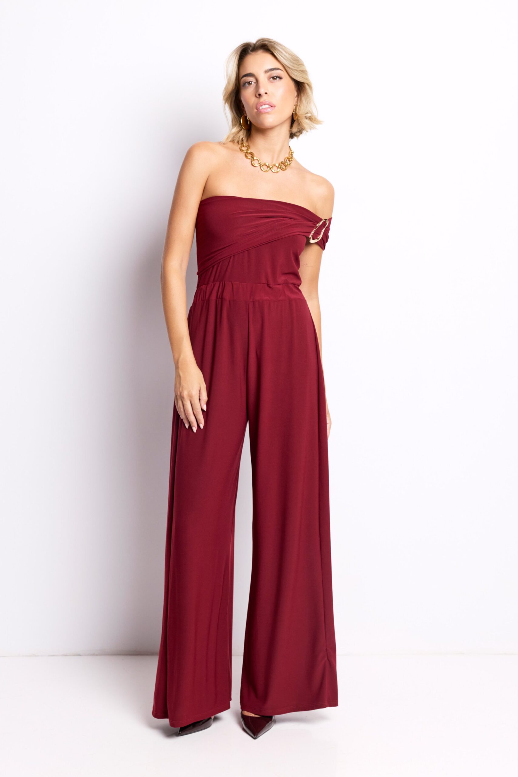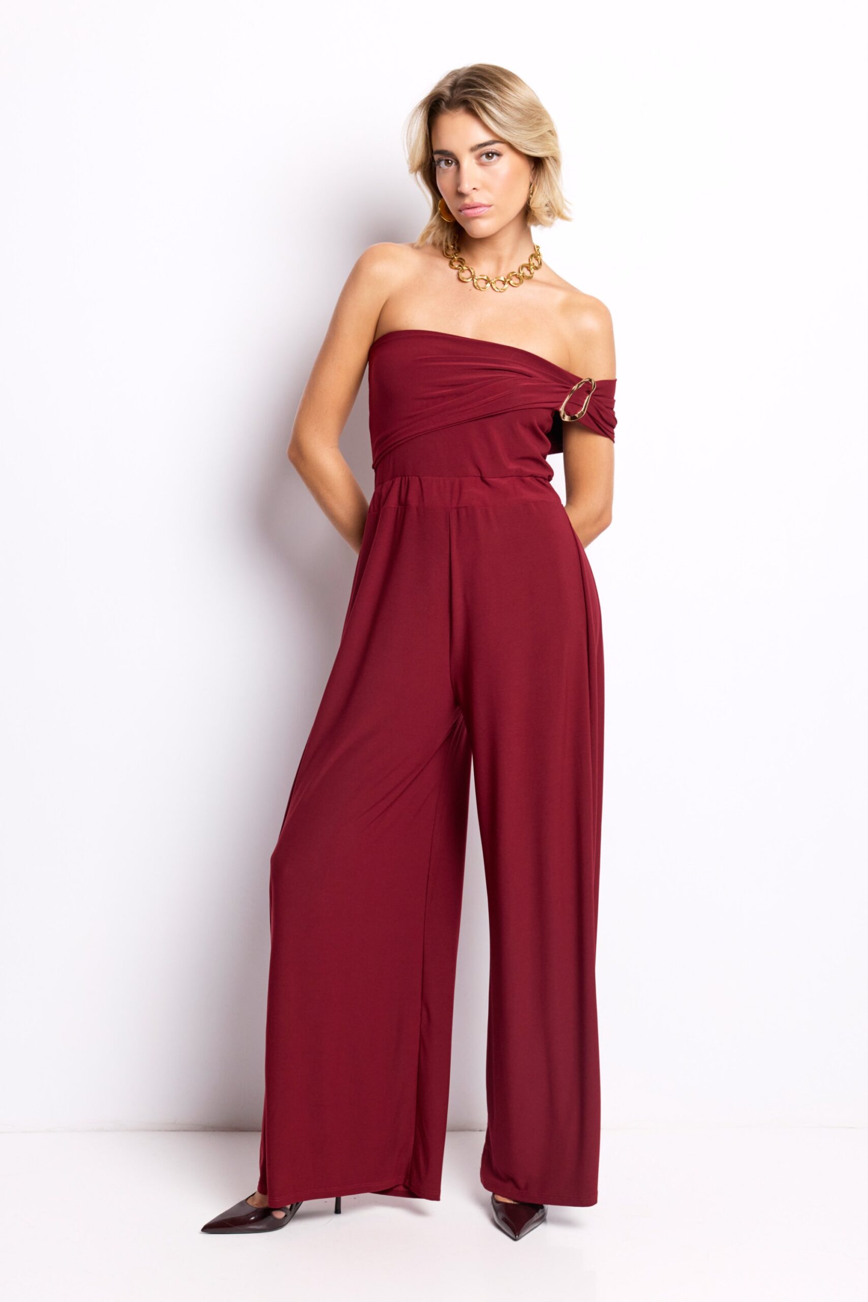 El Mono Elara es la definición de elegancia sin esfuerzo. Su tono burdeos intenso transmite carácter y feminidad, mientras que el detalle dorado en el hombro añade un punto de brillo sofisticado.