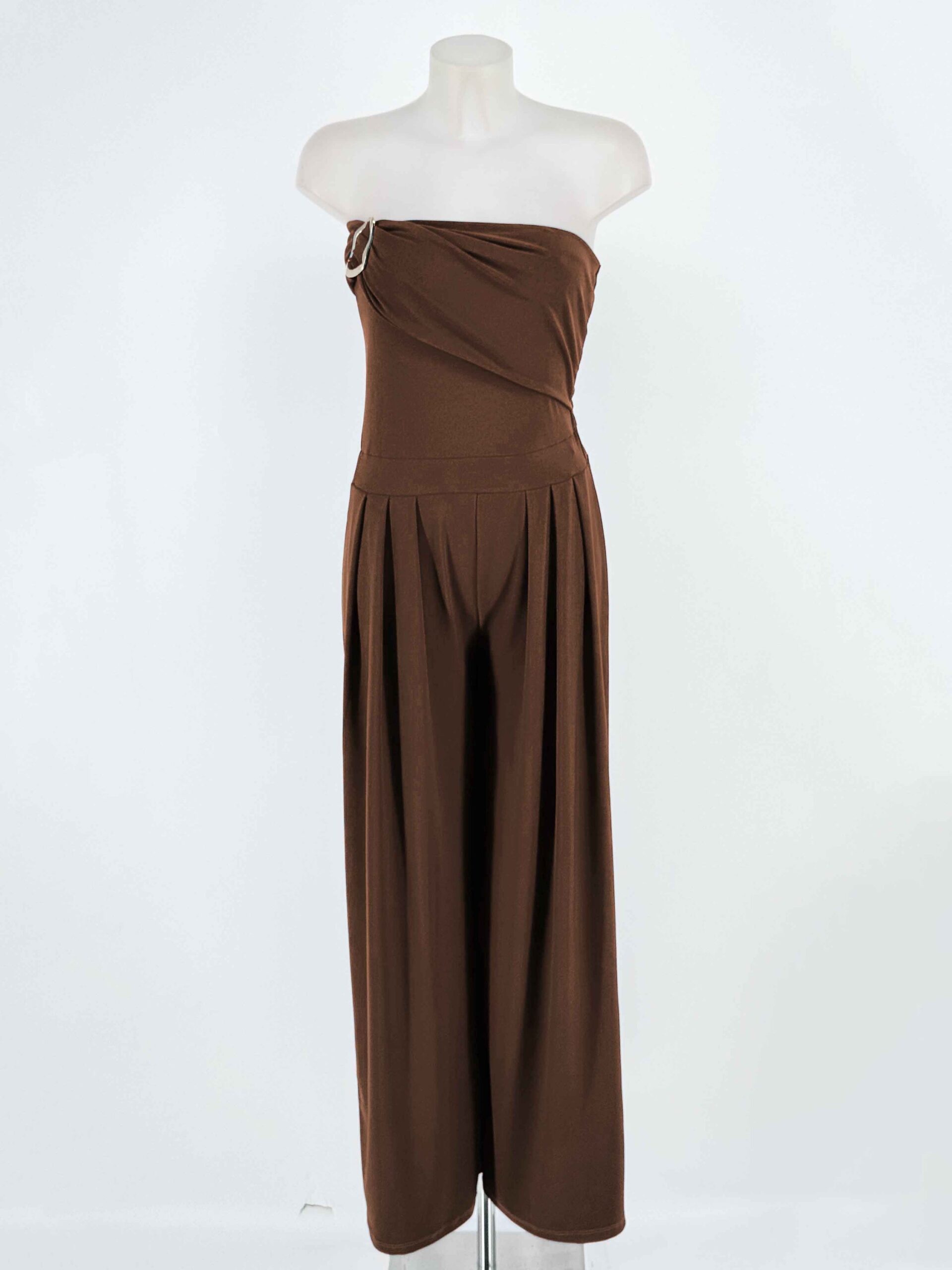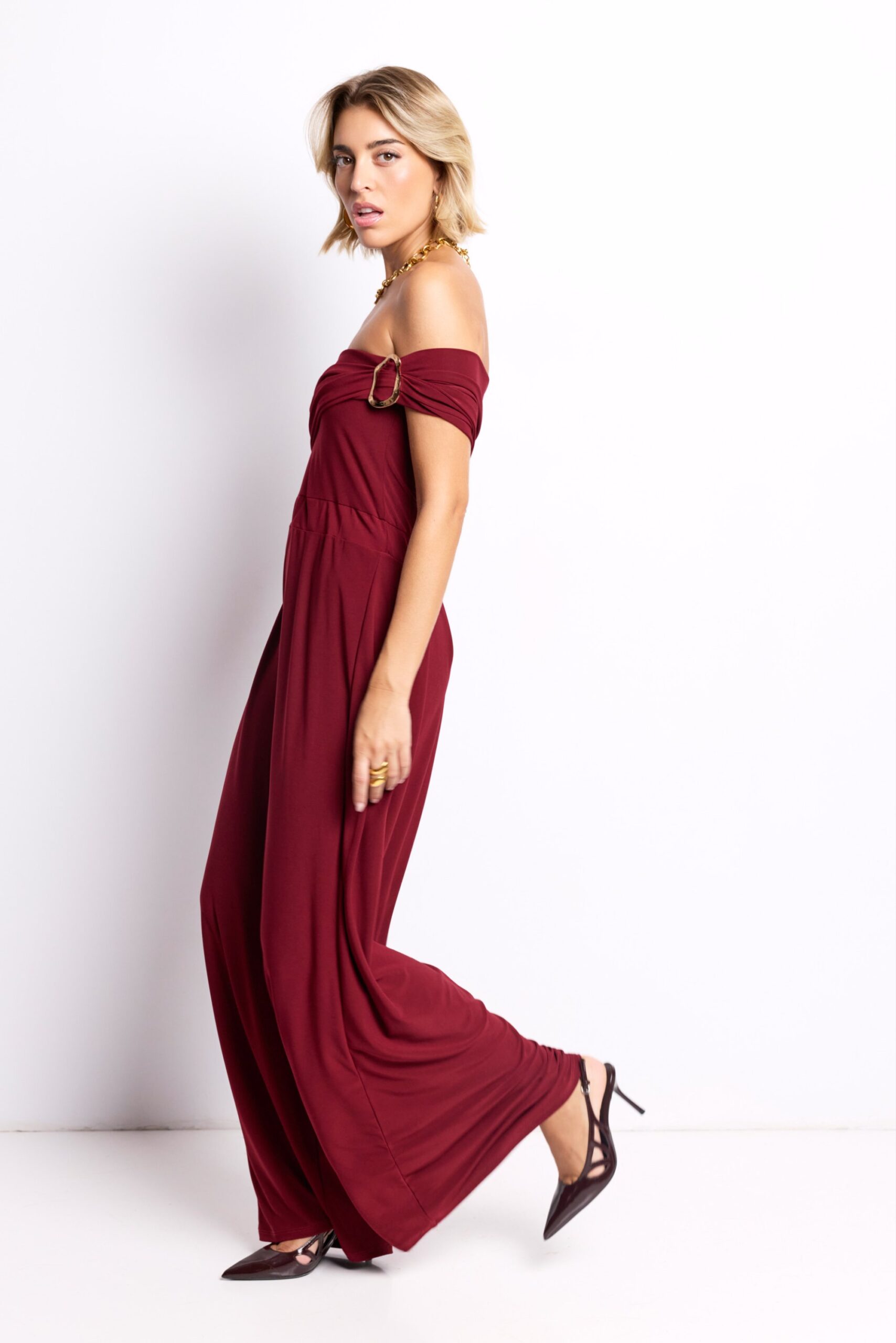 Mono largo color burdeos con escote asimétrico y anilla dorada. Sofisticación moderna con un toque de glamour.