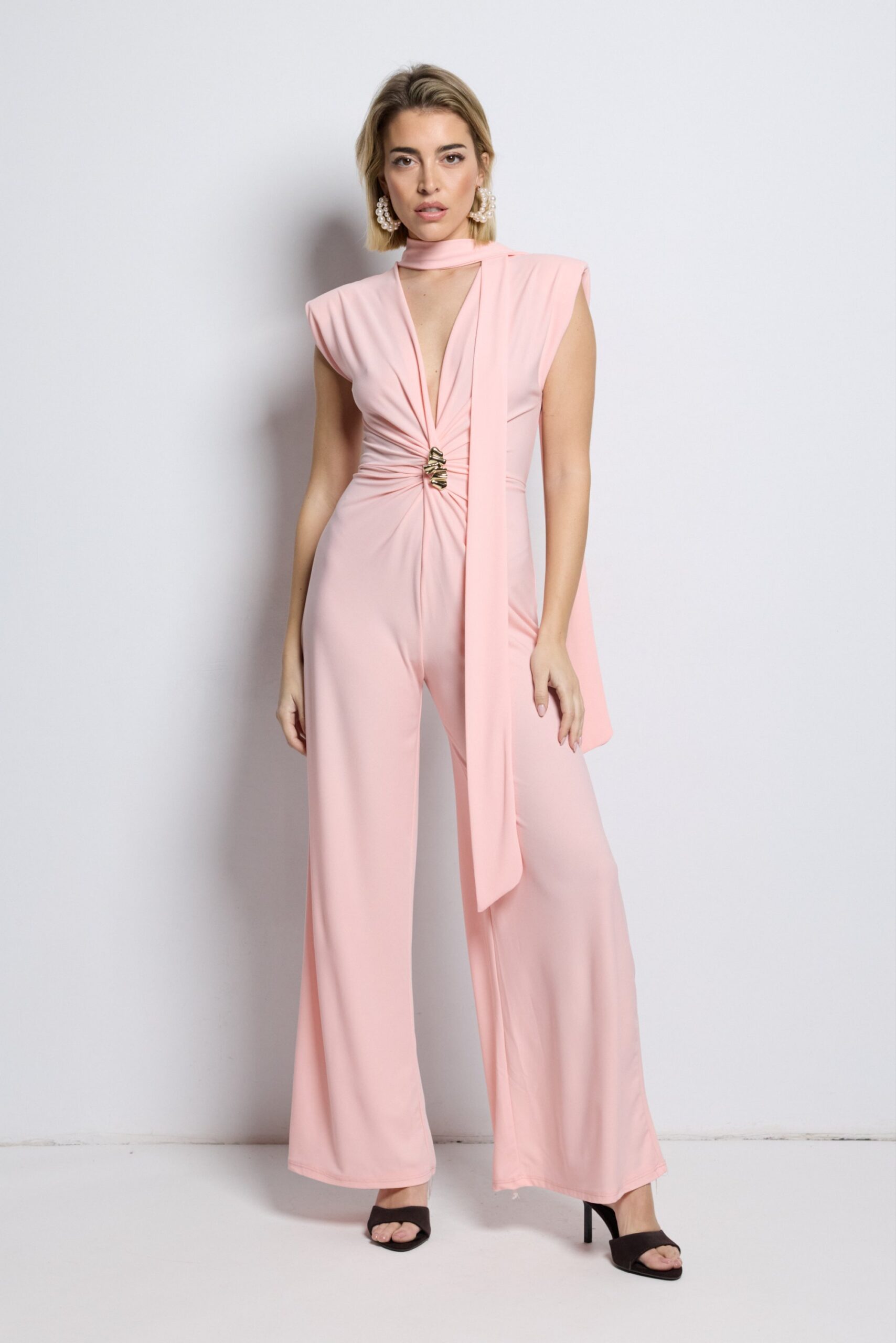 Su escote en V profundo alarga visualmente el torso, mientras el fruncido central con aplique dorado marca la cintura creando un efecto moldeador muy favorecedor. El pantalón palazzo aporta movimiento y elegancia, convirtiéndolo en una alternativa perfecta al clásico vestido de fiesta.