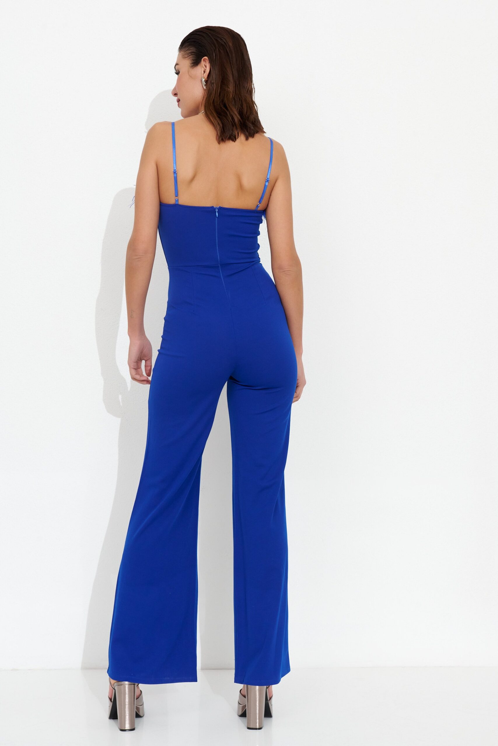 Mono largo azul de evento con tirantes finos y detalle de plumas en el escote. Elegante, moderno y muy favorecedor.