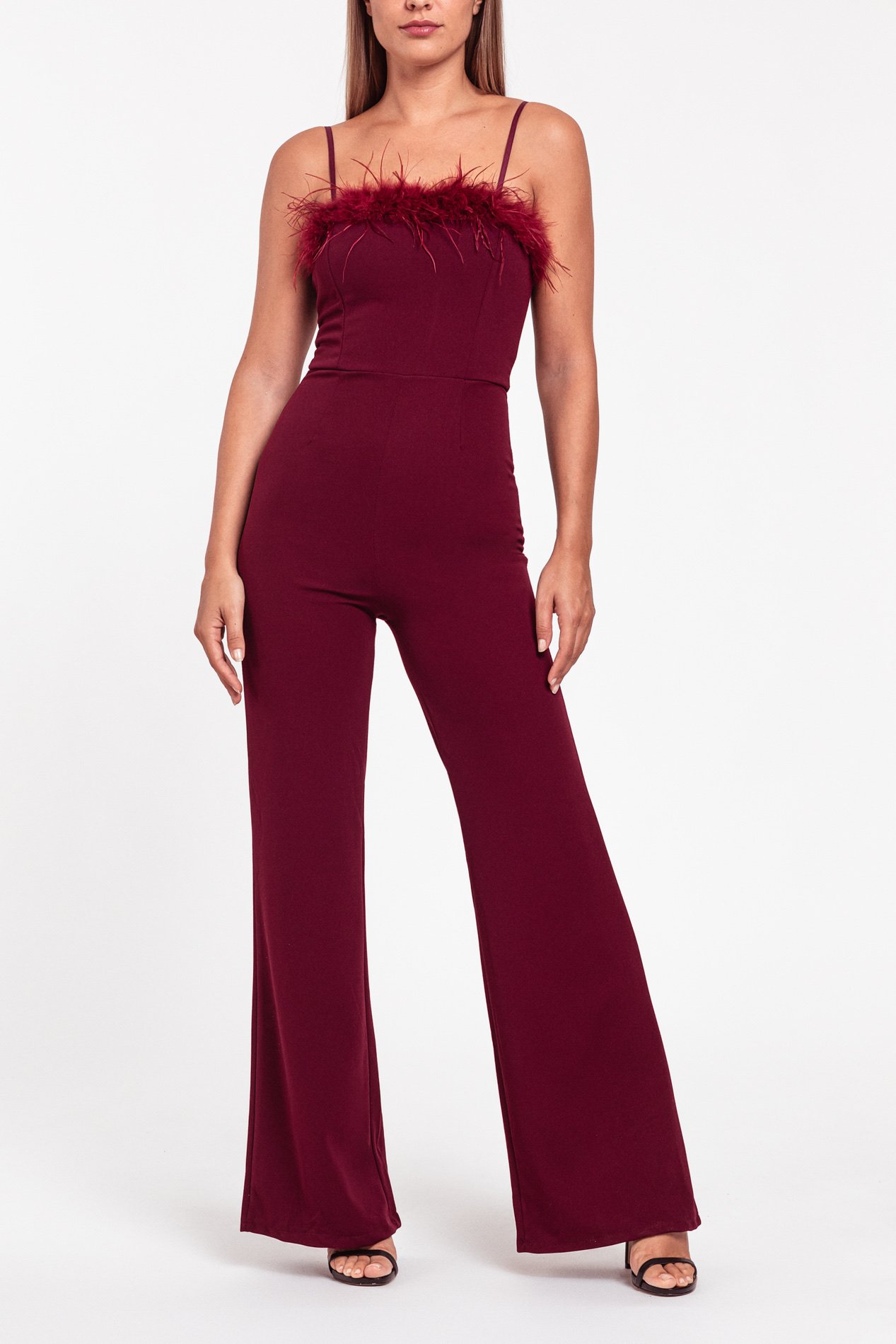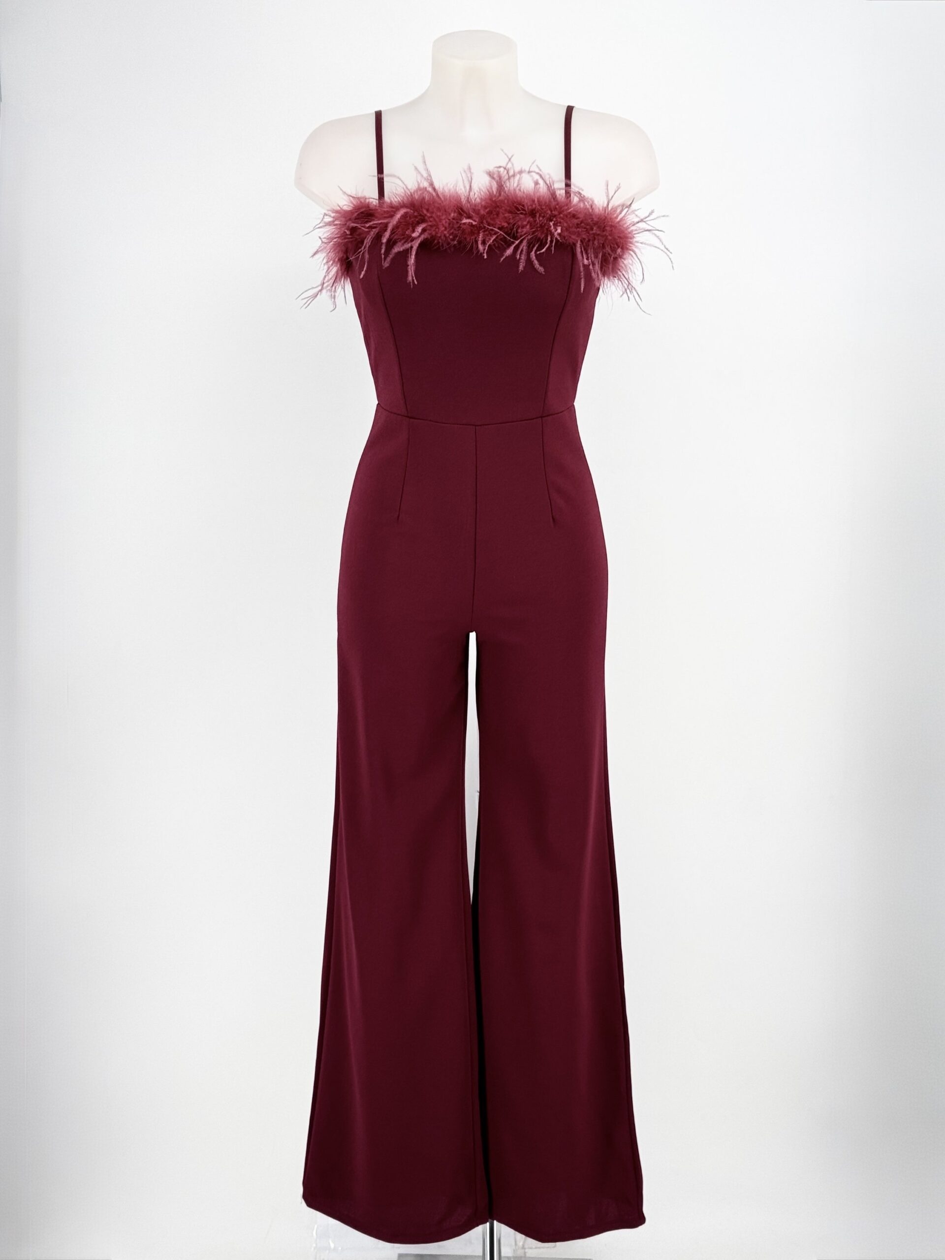 El diseño de tirantes finos y escote recto se eleva gracias al delicado detalle de plumas, que añade textura y un toque glam sin excesos. El corte entallado en la parte superior define la silueta, mientras que el pantalón largo de pierna ancha y fluida alarga visualmente las piernas y aporta movimiento al caminar.