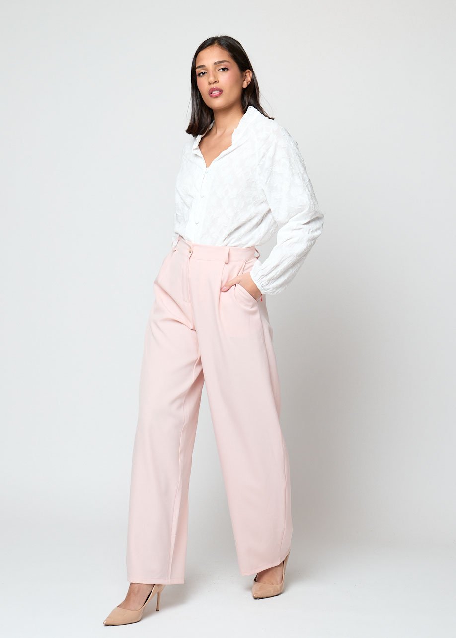 Pantalón ancho rosa de cintura alta con caída fluida. Elegante, femenino y perfecto para looks casual chic.