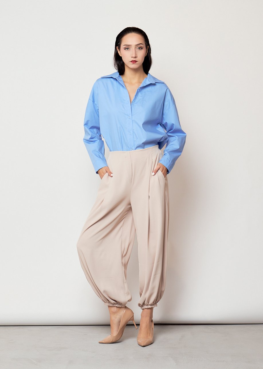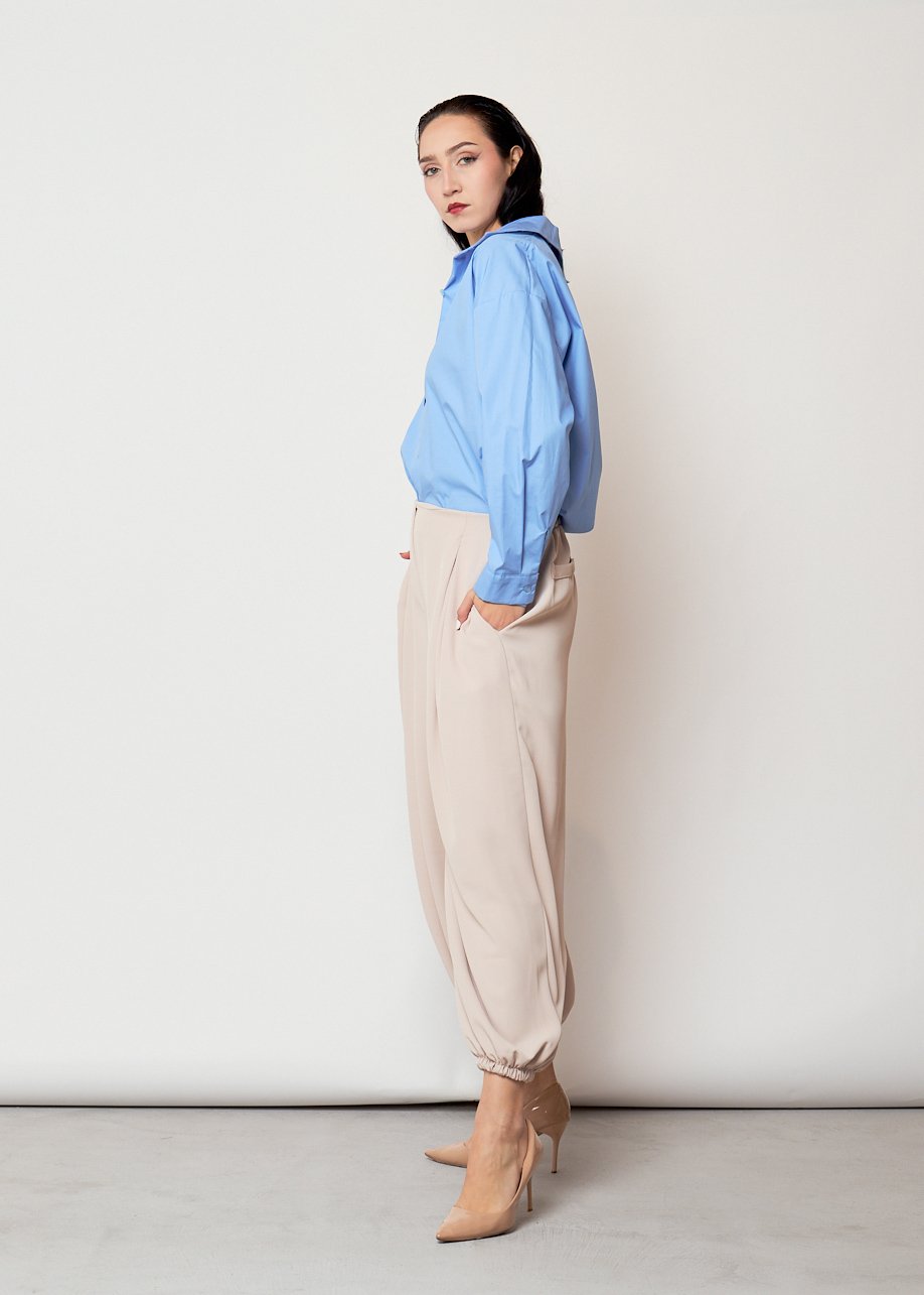 El detalle del bajo fruncido añade personalidad al pantalón y crea una silueta moderna que estiliza la figura y aporta movimiento al caminar.