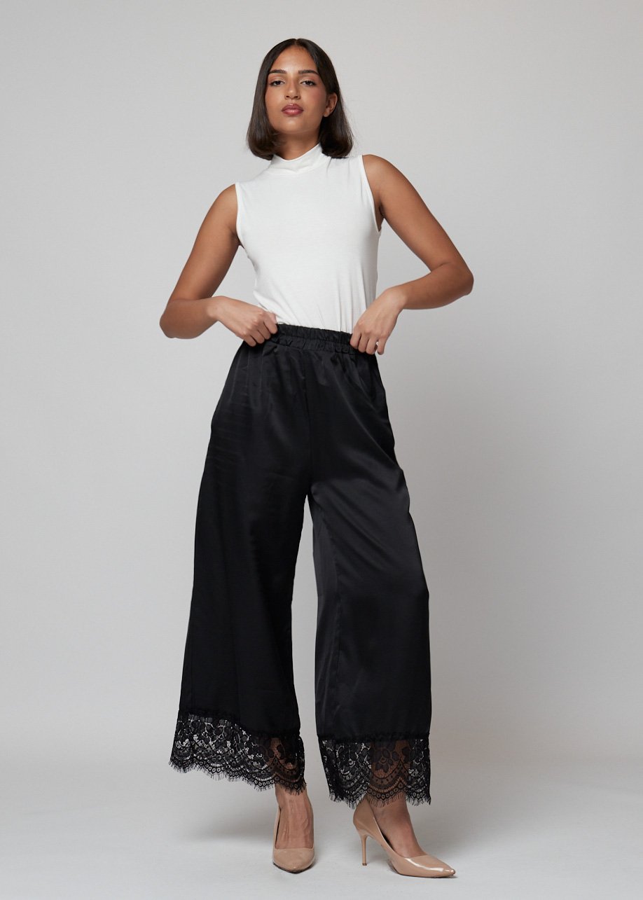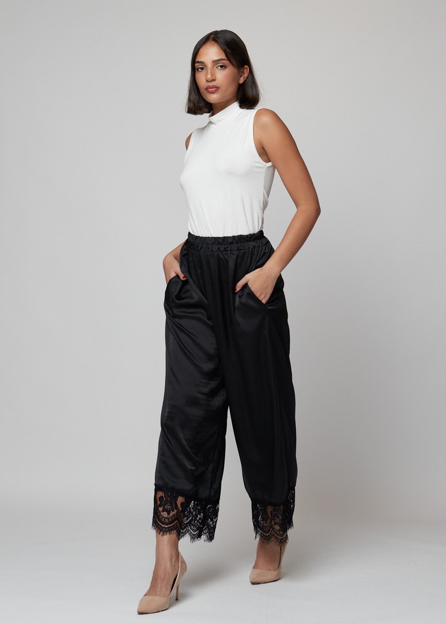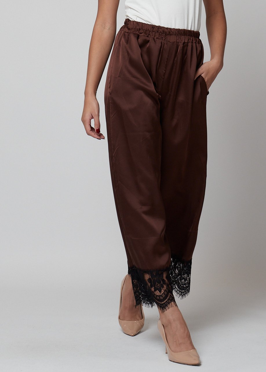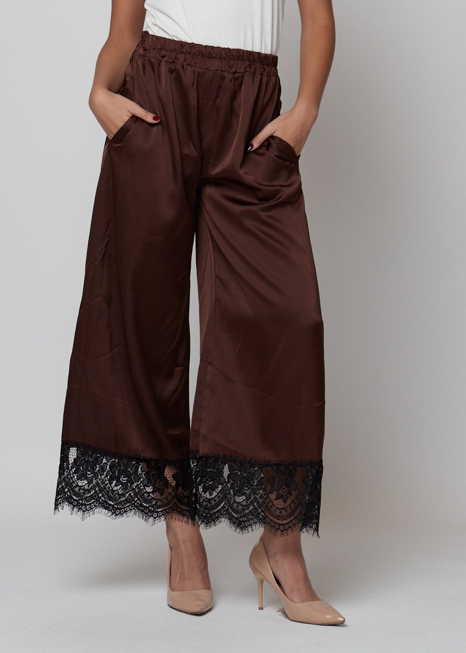 Pantalón satinado fluido con detalle de encaje. Disponible en negro y marrón. Elegante, cómodo y con caída perfecta.