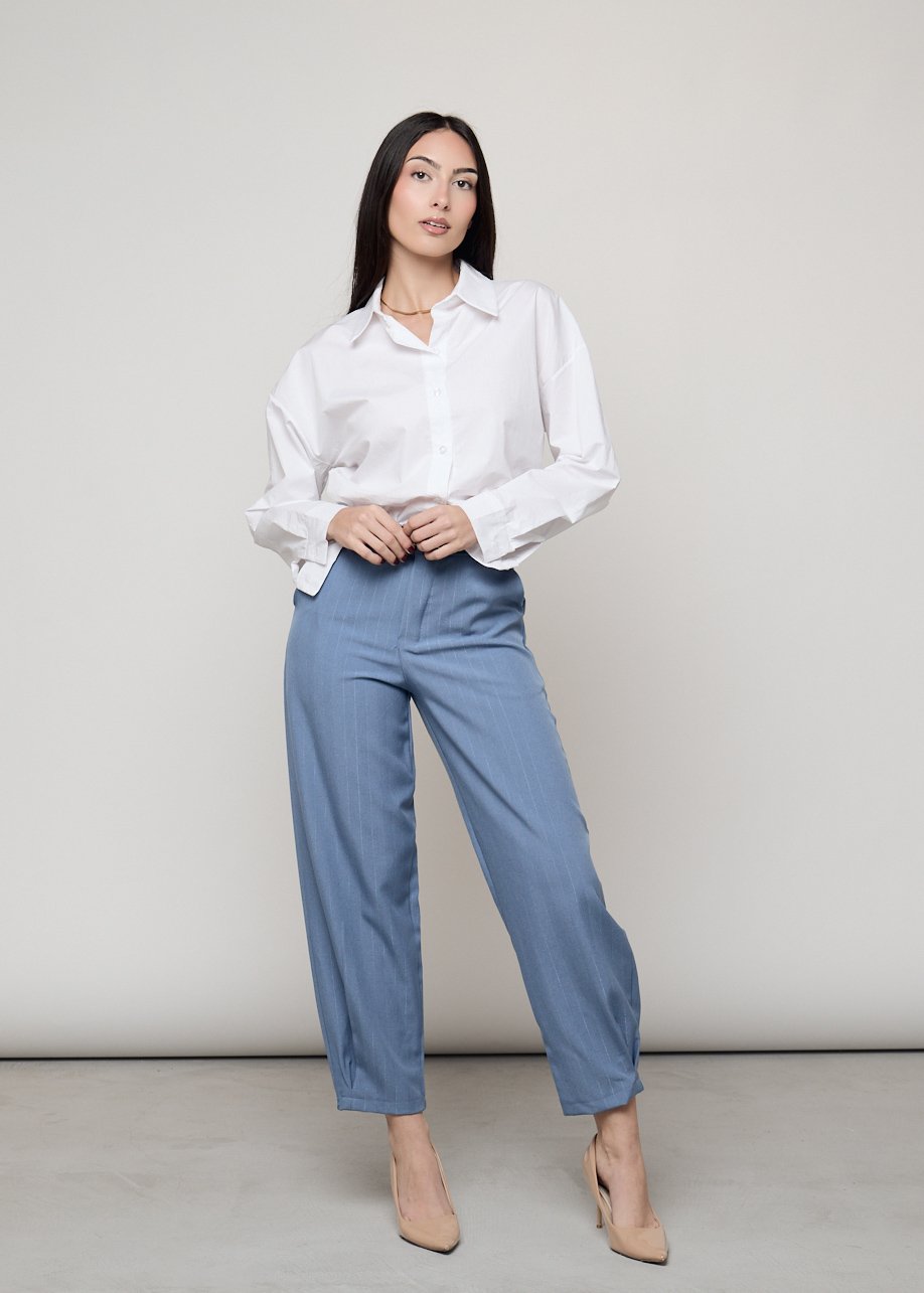 El tono azul suave con rayas finas verticales crea un efecto visual que alarga la figura y aporta una sensación de ligereza y movimiento. Es una prenda pensada para mujeres que buscan un look elegante sin renunciar a la comodidad.
