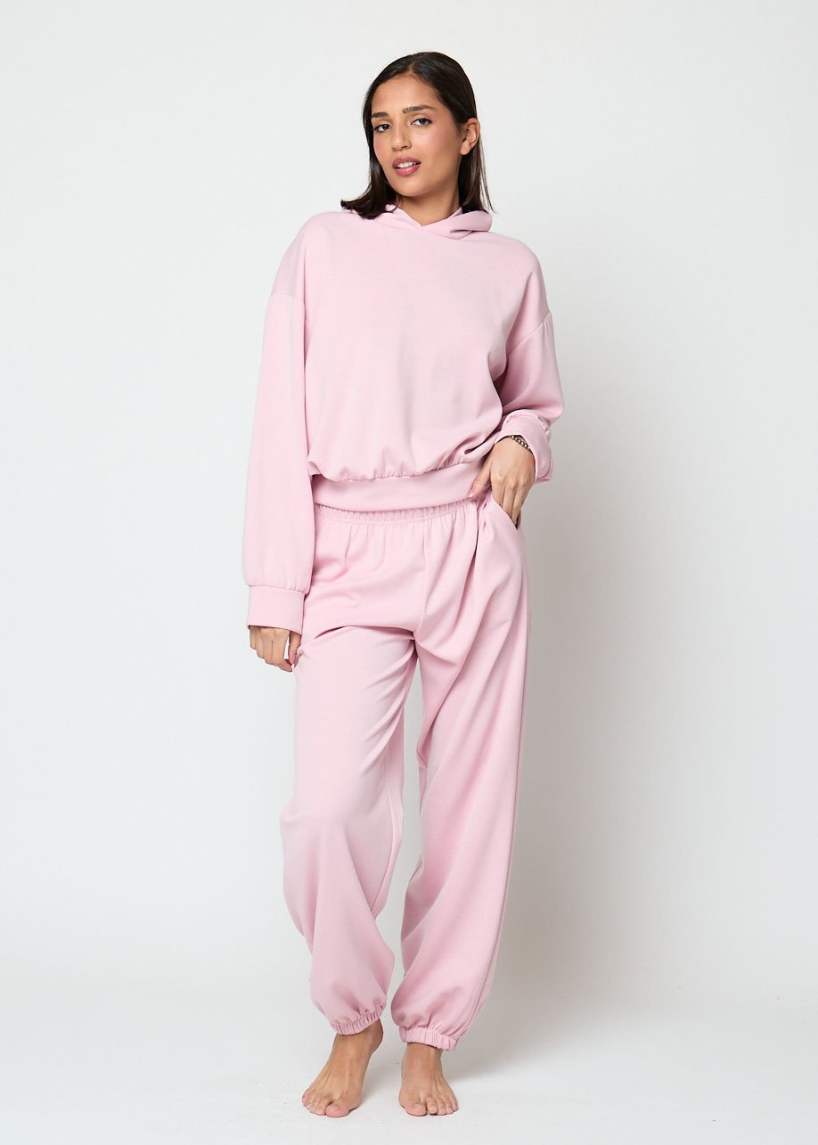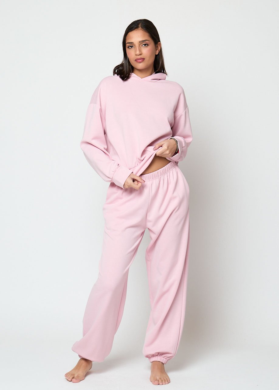 El tono rosa suave aporta un aire femenino y moderno, perfecto para combinar con sudaderas, camisetas básicas o conjuntos coordinados. Su tejido agradable y ligero lo hace ideal tanto para estar en casa como para looks casuales urbanos.
