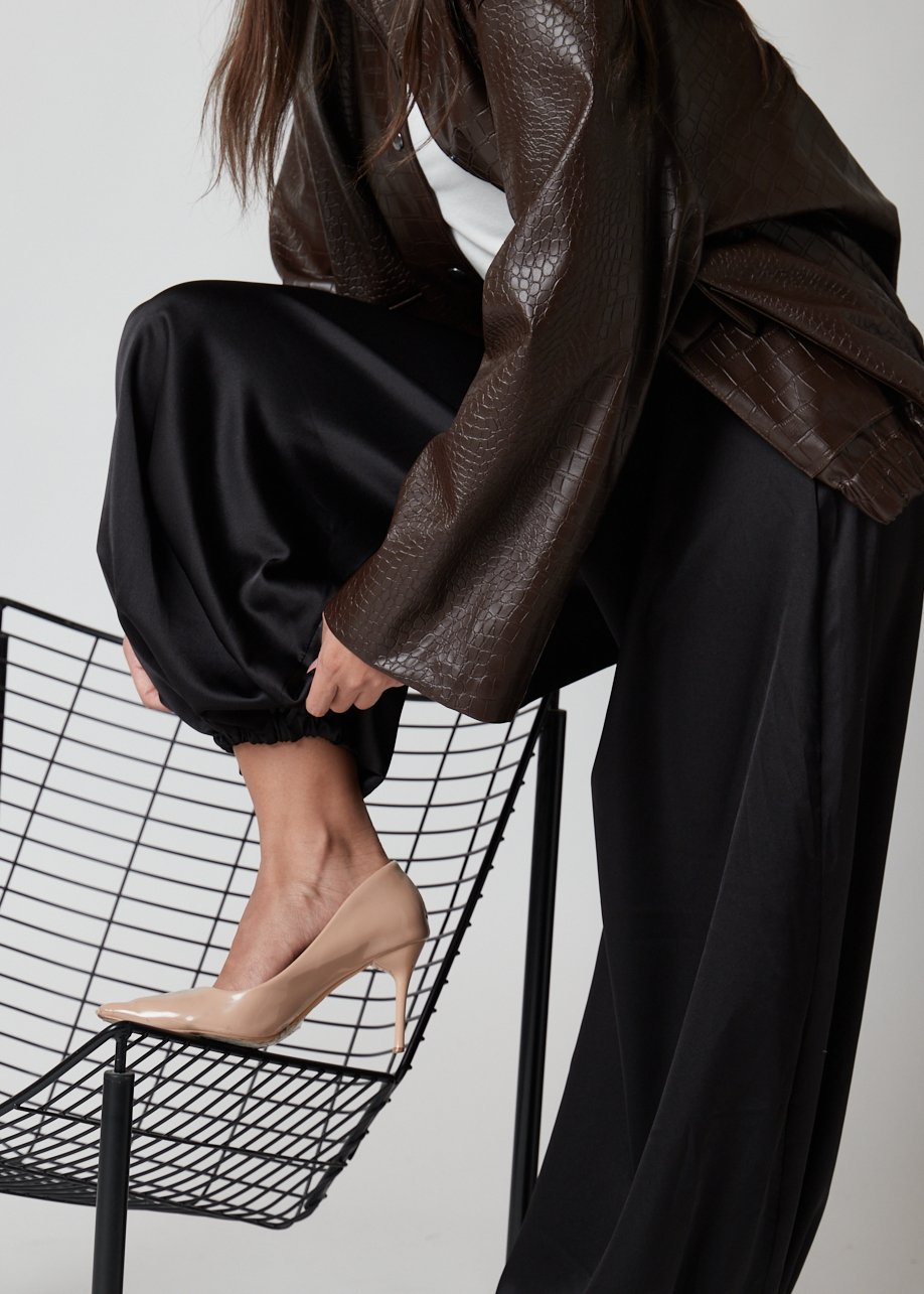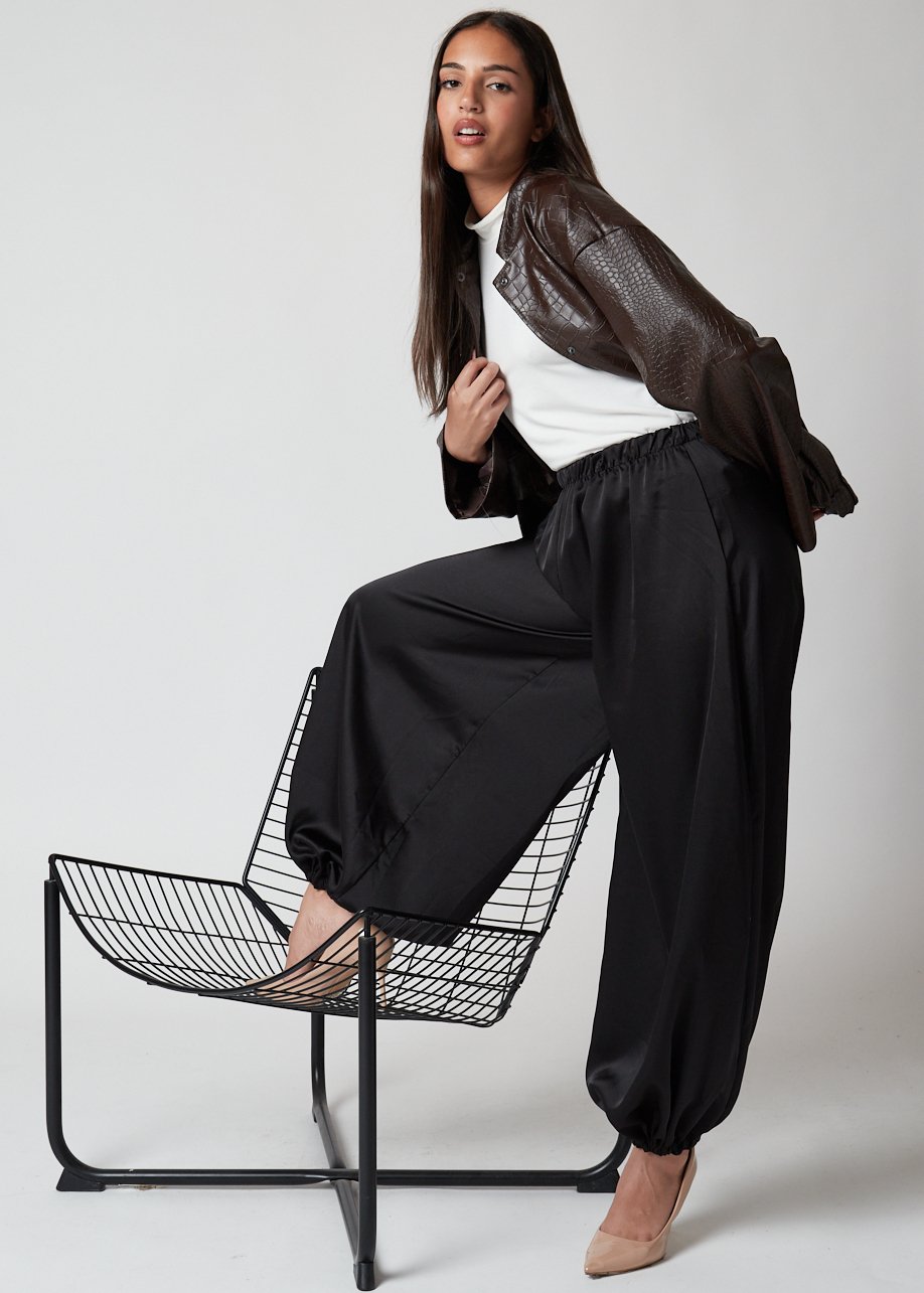 Pantalón Manirva beige satinado con puño elástico, fluido y sofisticado, perfecto para looks casuales y chic.