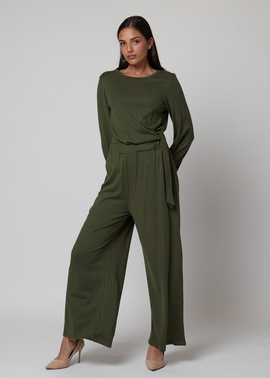 Pantalón fluido verde oliva de corte ancho y cintura elástica. Cómodo, versátil y perfecto para looks casual chic.