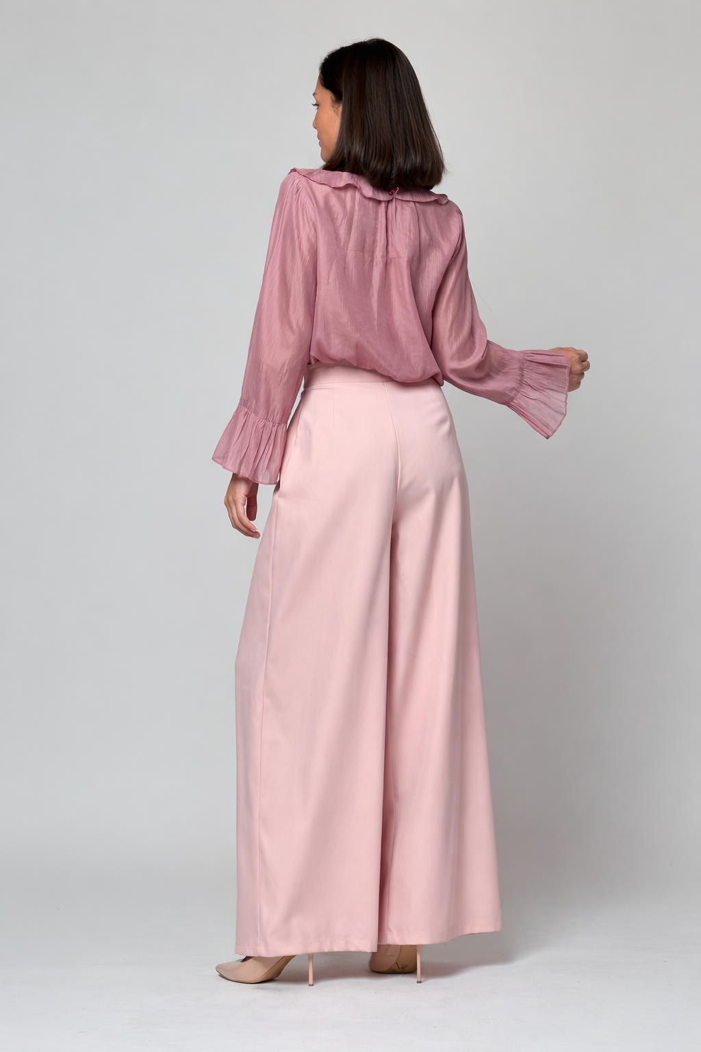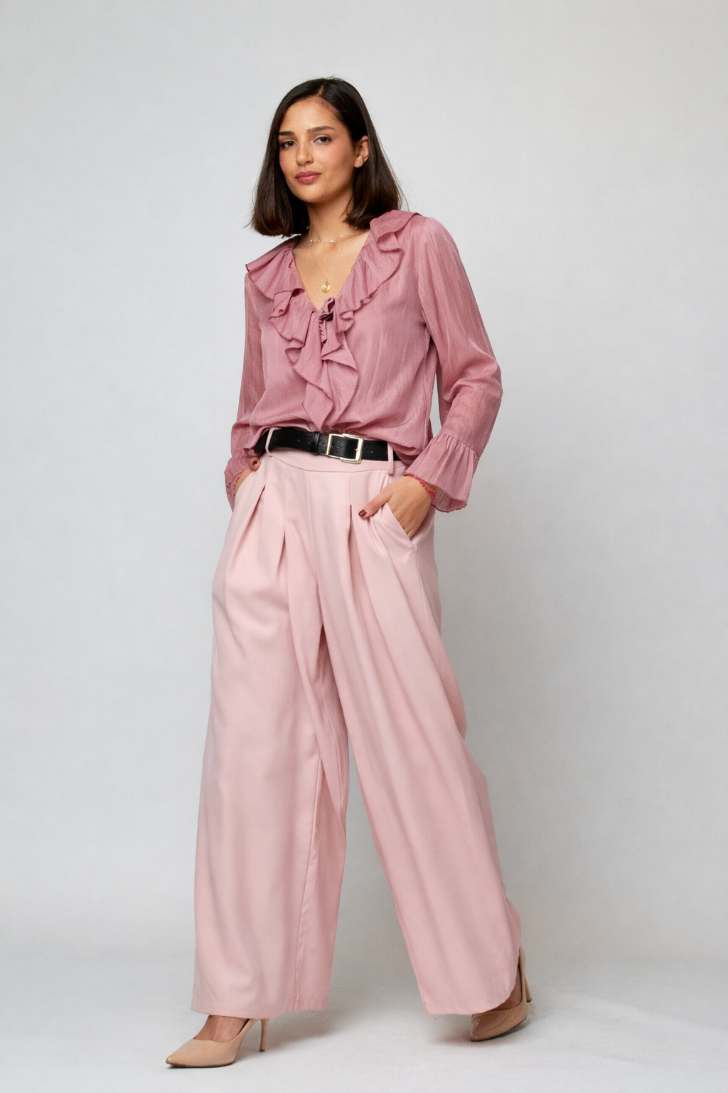 Pantalón palazzo rosa de mujer con corte fluido y elegante. Perfecto para looks casual chic cómodos y sofisticados.
