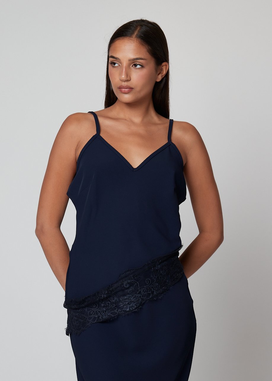 Su corte fluido, el escote en pico y los tirantes finos ajustables realzan la silueta con un toque sutil y sofisticado. El detalle de encaje en el bajo, con acabado asimétrico, añade un aire romántico y chic que eleva cualquier look.