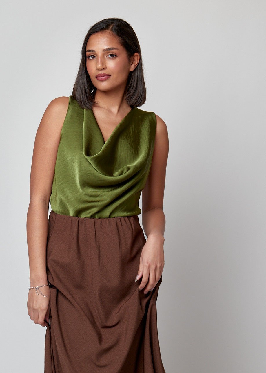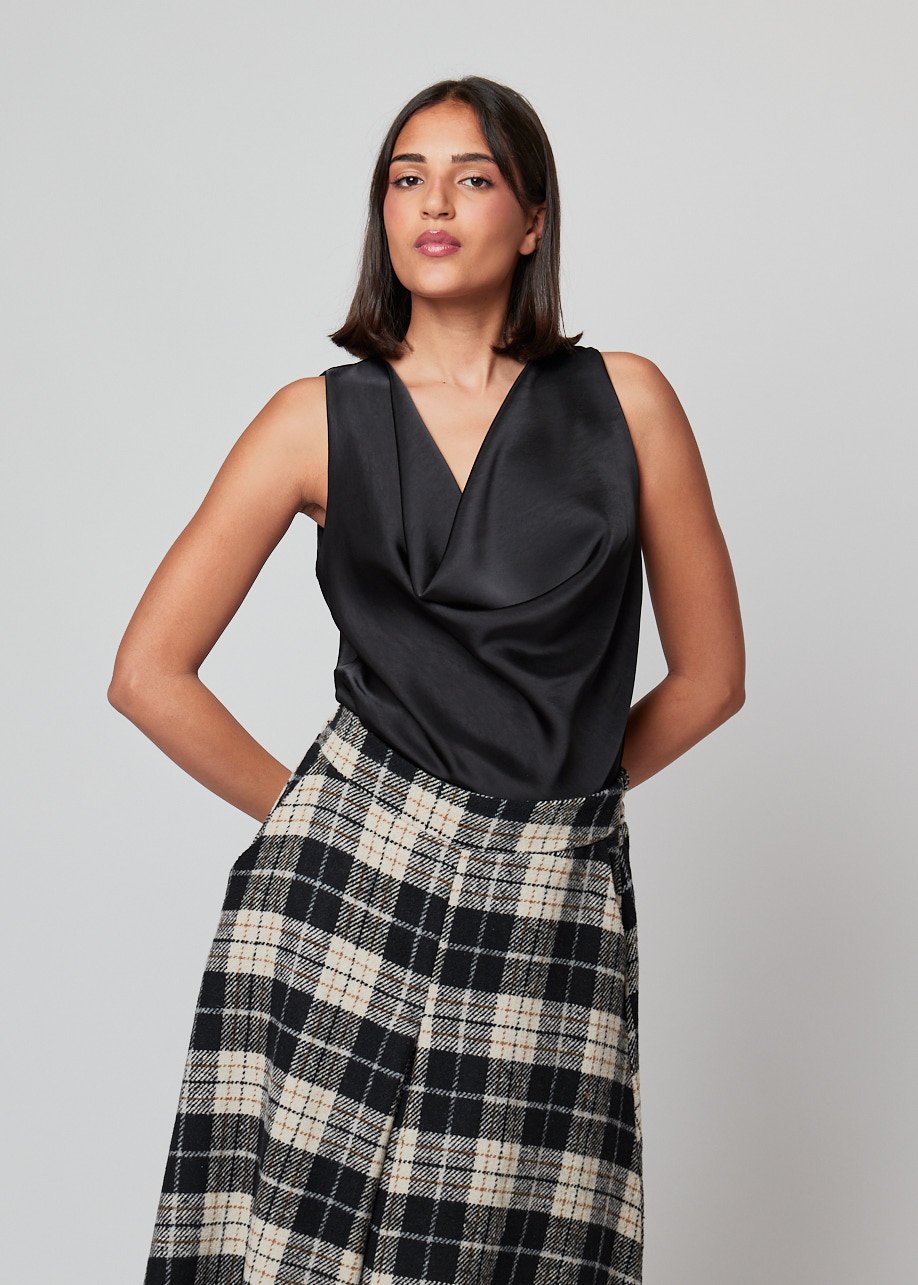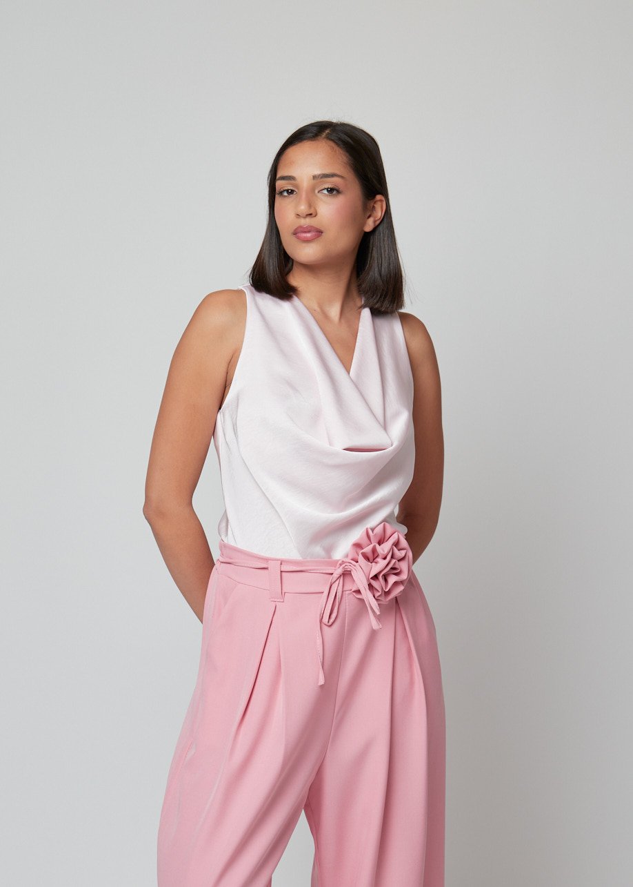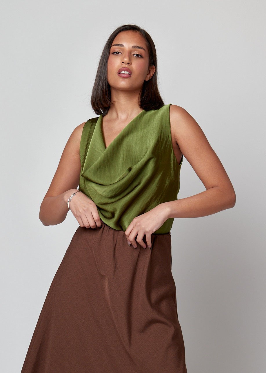 Top sin mangas con escote drapeado y caída fluida. Elegante, versátil y perfecto para looks diarios con estilo.