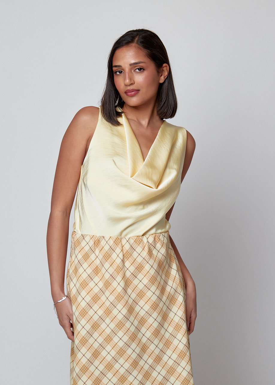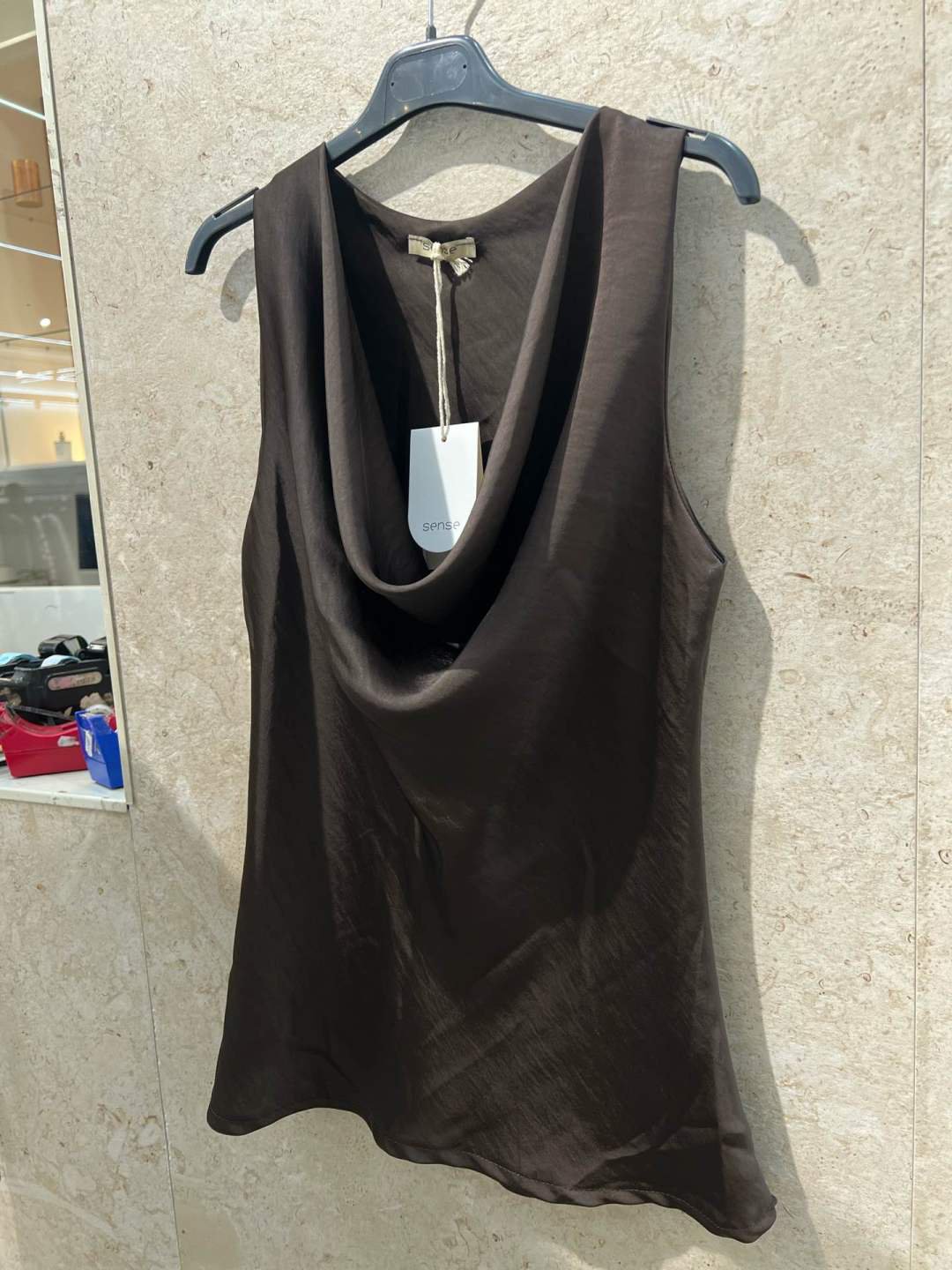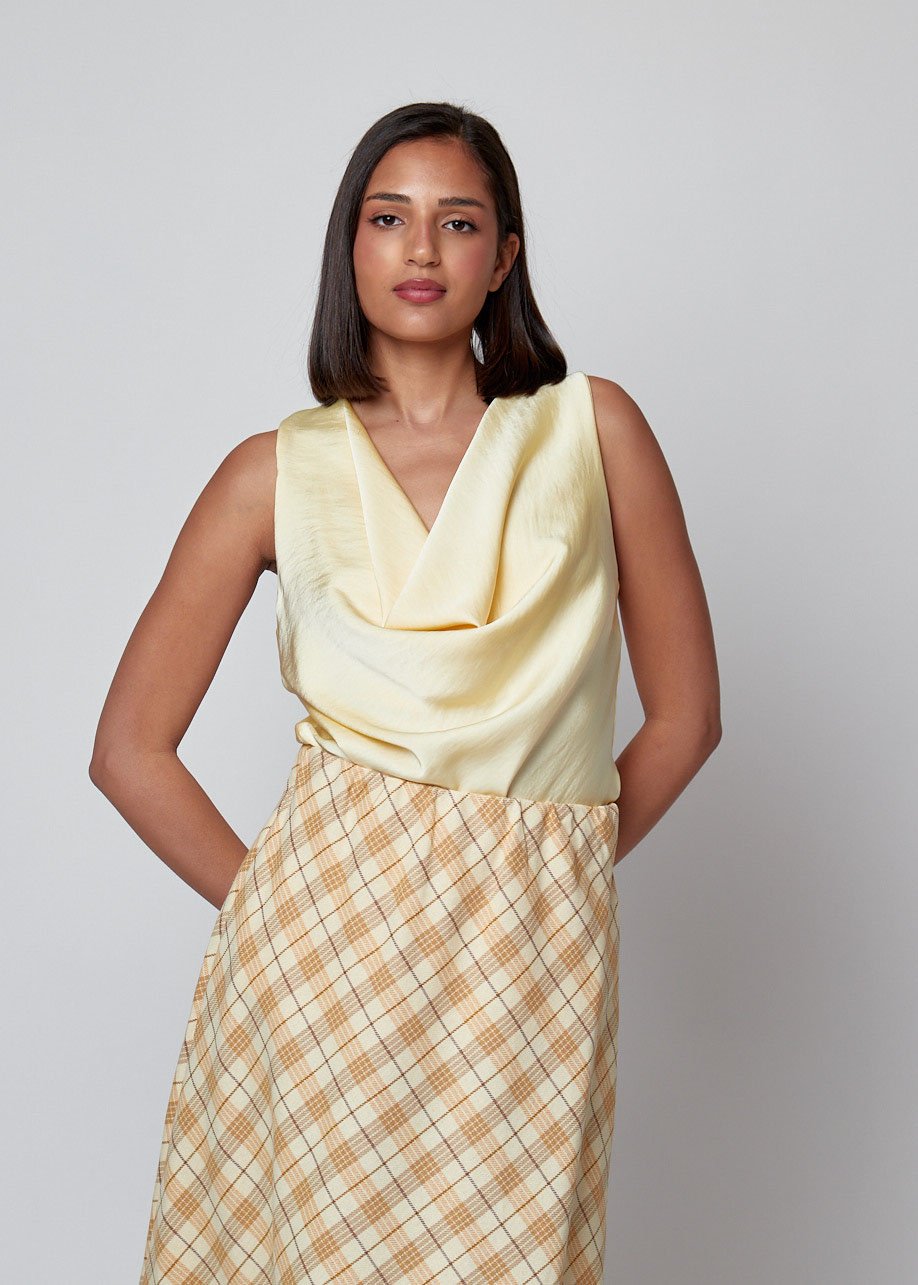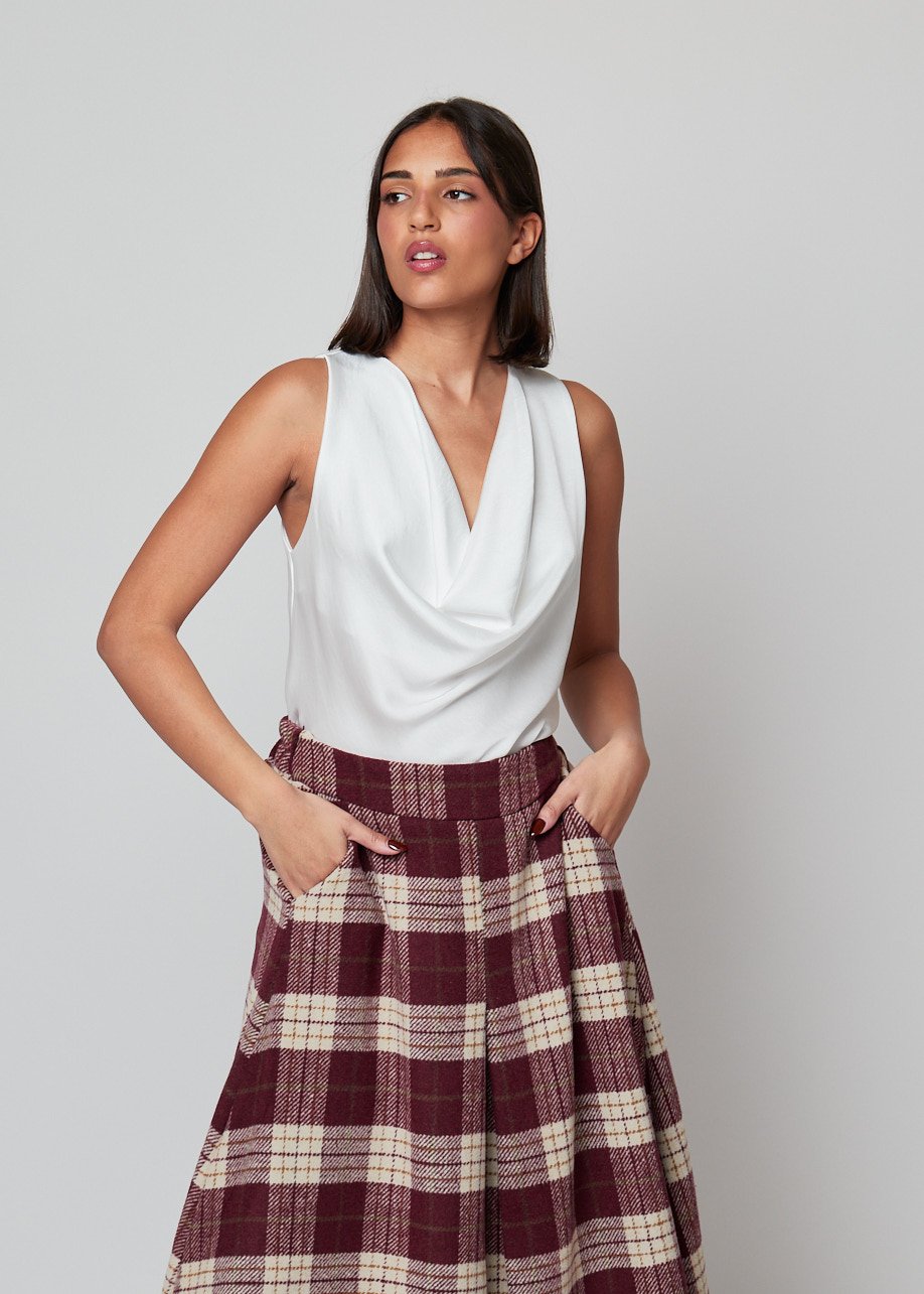 Top sin mangas con escote drapeado y caída fluida. Elegante, versátil y perfecto para looks diarios con estilo.